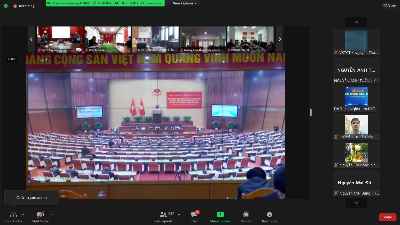 Dự hội nghị tại các điểm cầu trung ương và các điểm cầu trong toàn quốc có các ủy viên Bộ Chính trị, bí thư Trung ương Đảng, ủy viên Trung ương Đảng, các Tỉnh ủy, Thành ủy, Ban cán sự Đảng, Đảng đoàn, Đảng ủy trực thuộc trung ương; lãnh đạo các ban, bộ, ngành, Mặt trận Tổ quốc Việt Nam và các đoàn thể chính trị – xã hội của trung ương và địa phương. Đảng bộ Trường Đại học Thủy lợi có một đầu cầu với sự tham gia của hơn 500 đồng chí đảng viên.