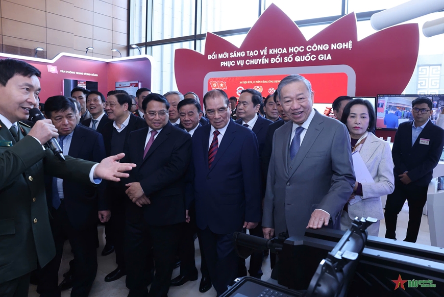 Tổng Bí thư Tô Lâm và các đại biểu tham quan khu trưng bày sản phẩm khoa học, công nghệ.