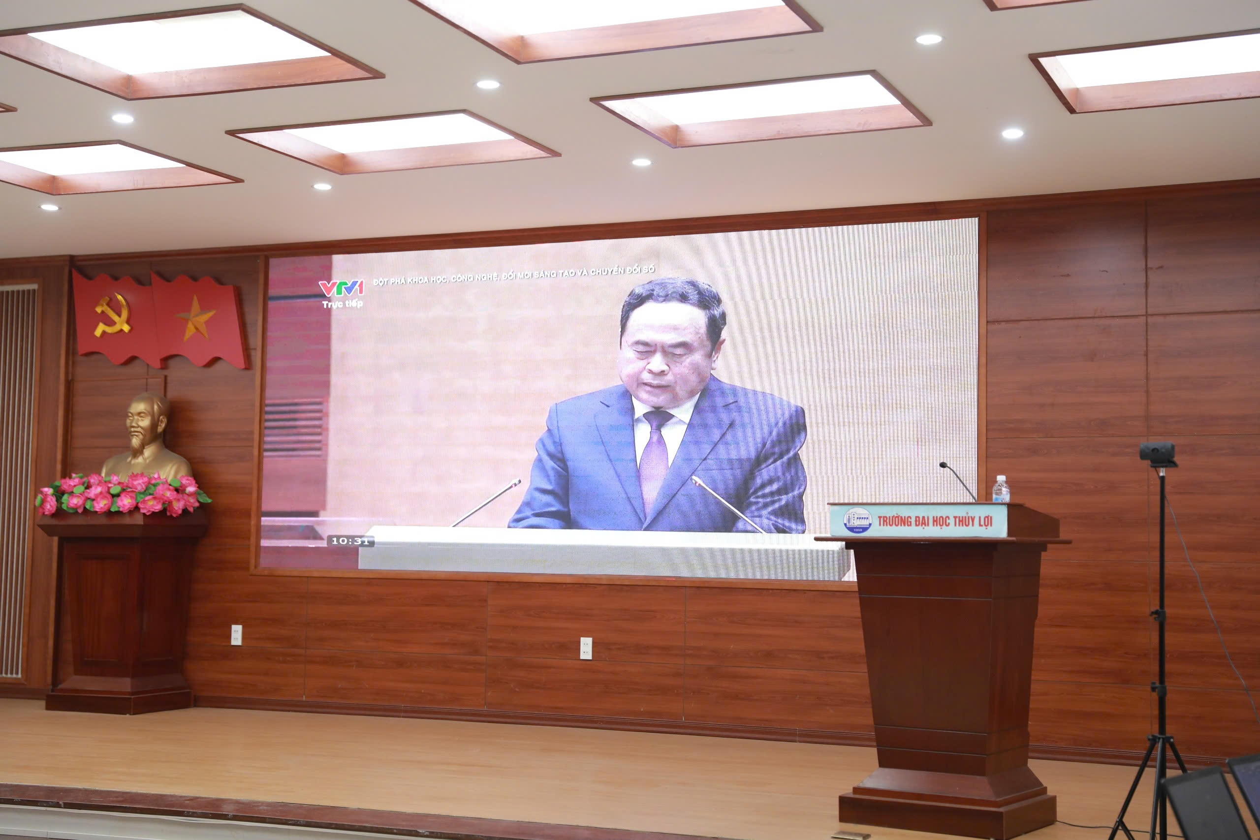 Tại Trường Đại học Thủy lợi, các cán bộ, đảng viên của Trường cũng tham dự bằng hình thức trực tuyến (tiếp nối điểm cầu của Đảng ủy Khối) tại Hội trường T35.