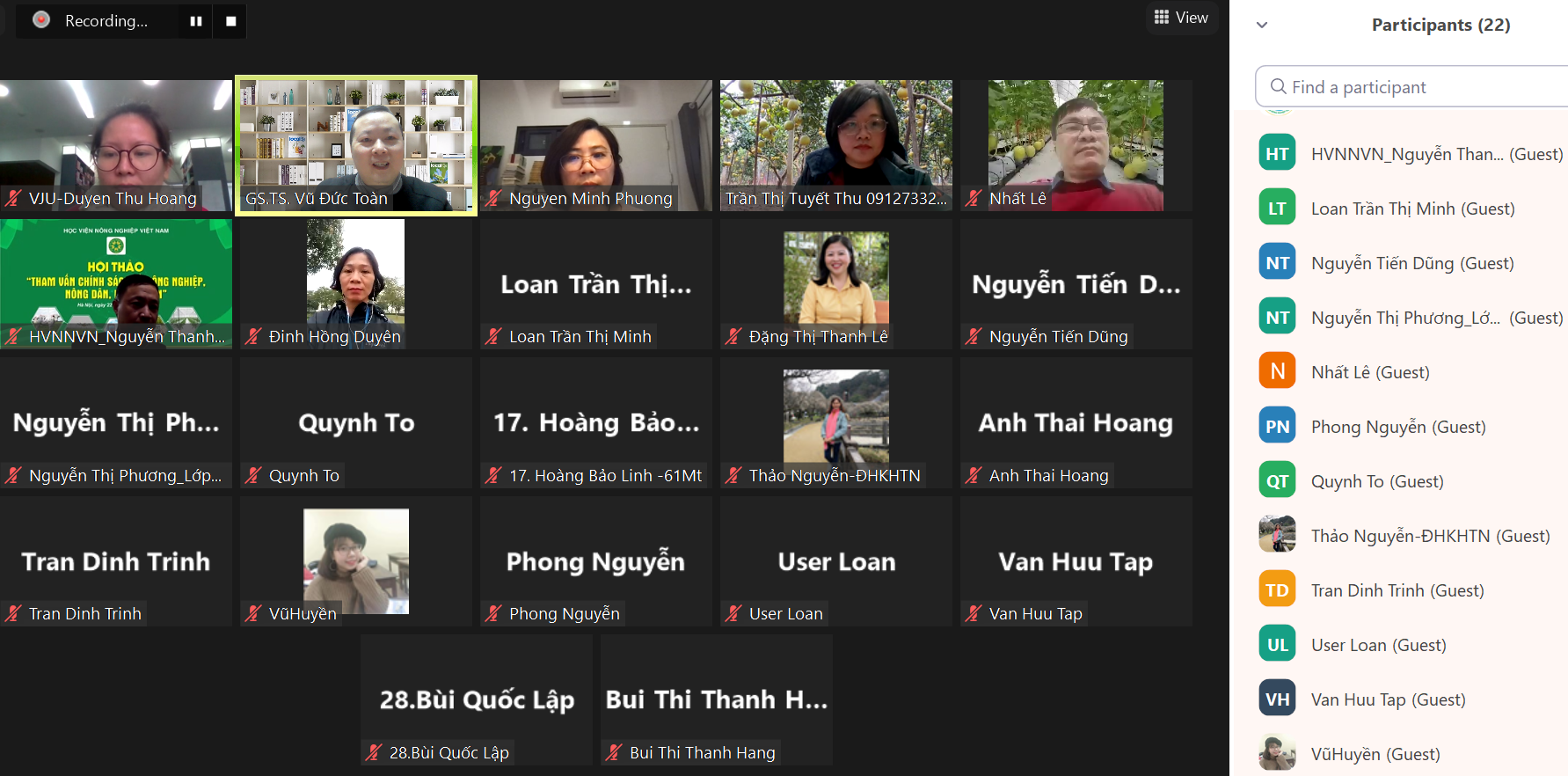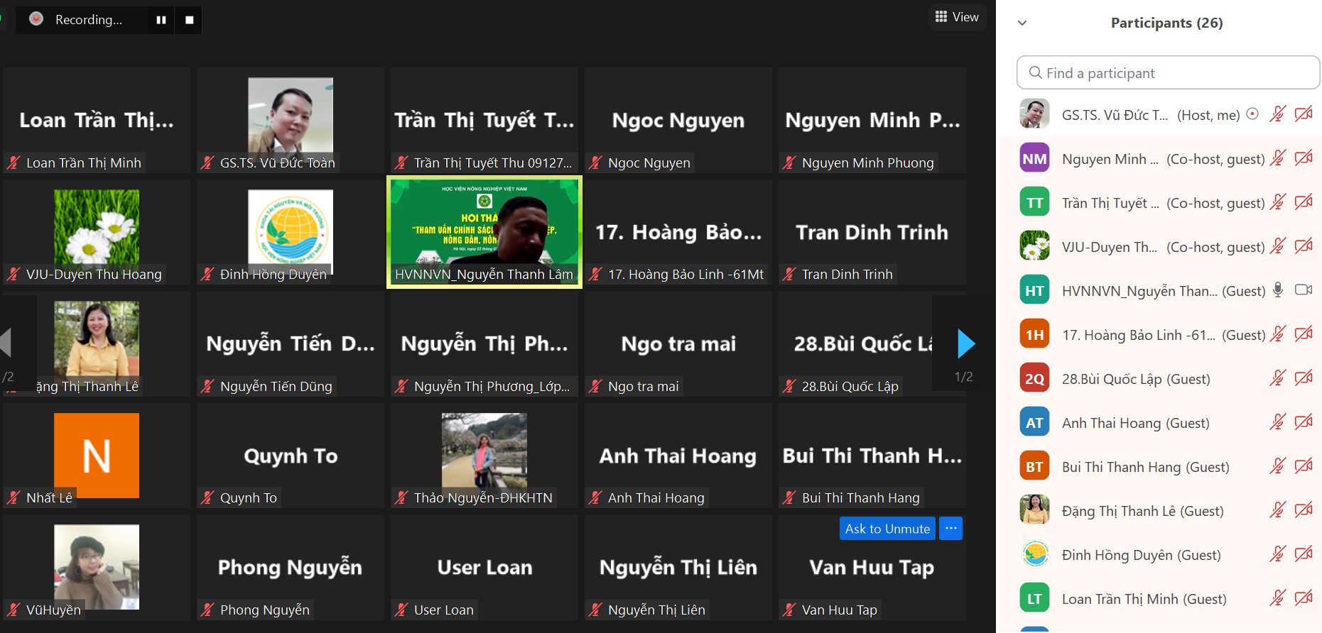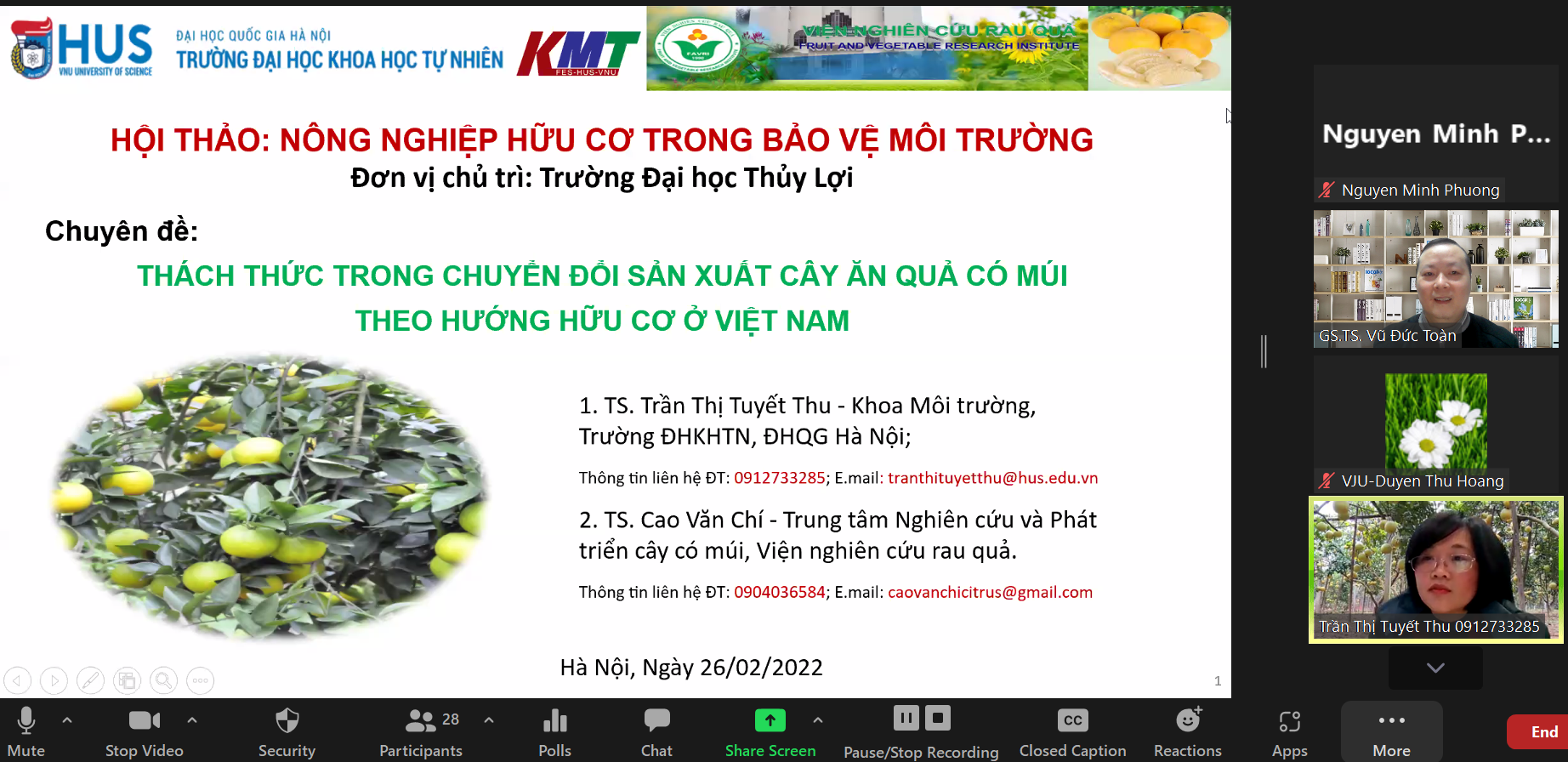 Tương tự, ngày 26/02/2022 nhóm ROOM (Nghiên cứu các hợp chất hữu cơ/Research of Organic Matter) – TLU đã tổ chức hội thảo online với chủ đề “Nông nghiệp hữu cơ trong bảo vệ môi trường”. Tại hội thảo nhóm ROOM đã trình bày 03 bài tham luận về: (1) Sức khỏe đất – nền tảng của nền nông nghiệp hữu cơ (do TS. Hoàng Thi Thu Duyến trình bày); (2) Tiềm năng tái sử dụng một số nguồn thải trong cải tao đất nông nghiệp (do PGS.TS. Nguyễn Minh Phương trình bày); (3) Thách thức trong chuyên đổi sản xuất cây ăn quả có múi theo hướng hữu cơ ở Việt Nam (do TS. Trần Tuyết Thu trình bày).