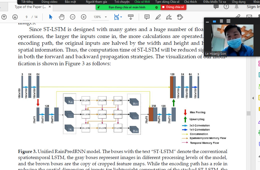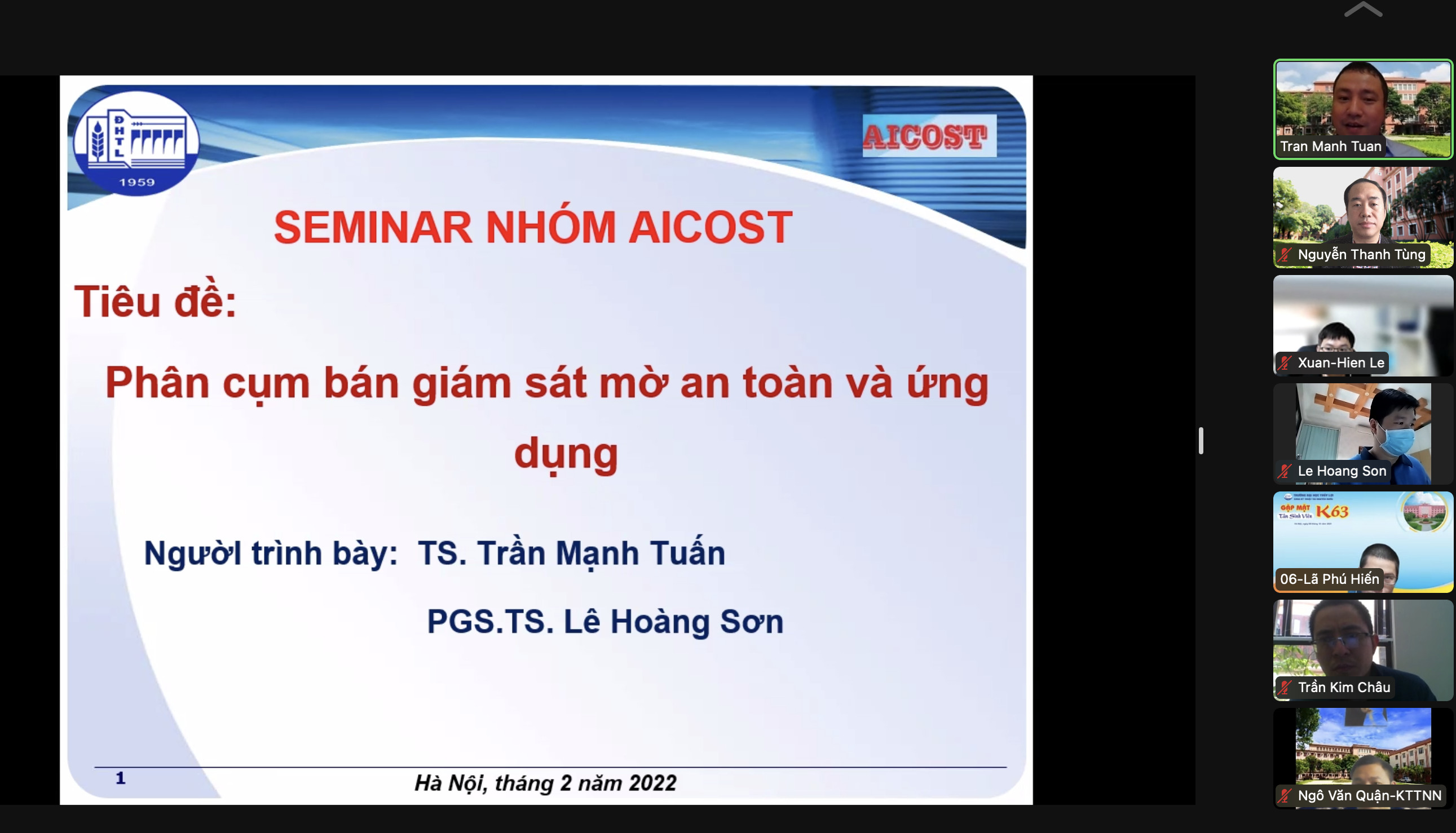 Ngày 28/02/2022, nhóm AICOST (Trí tuệ nhân tạo cho biến đổi khí hậu và điều khiển hệ thống/Artificial Intelligence for Tackling Climate Change and Controlling System) – TLU đã tổ chức thành công Hội thảo với 02 bài tham luận về: (1) RainPredRNN: A New Approach for Precipitation Nowcasting with Weather Radar Echo Images Based on Deep Learning (RainPredRNN: một phương pháp tiếp cận mới trong dự báo lượng mưa dưa với dữ liệu ảnh radar thời tiết trên Deep Learning) (do PGS.TS. Lê Hoàng Sơn trình bày); (2) Phân cụm bán giám sát mờ an toàn và ứng dụng (do TS. Trần Mạnh Tuấn và PGS.TS. Lê Hoàng Sơn trình bày).