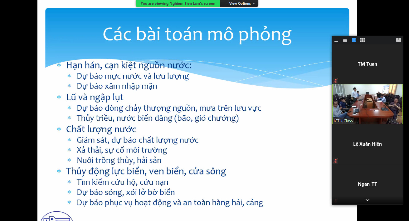 Tương tự vào ngày 27/4/2021, Nhóm Trí tuệ nhân tạo cho biến đổi khí hậu và điều khiển hệ thống (Artificial Intelligence for Tackling Climate Change and Controlling System – AICOST) – TLU đã trình bày 02 bài tham luận về: (1) Một số hệ thống tính toán và dự báo nguồn nước (do PGS.TS. Nghiêm Tiến Lam trình bày); (2) Mô hình học máy bán giám sát trong dự báo (do TS. Trần Mạnh Tuấn trình bày).