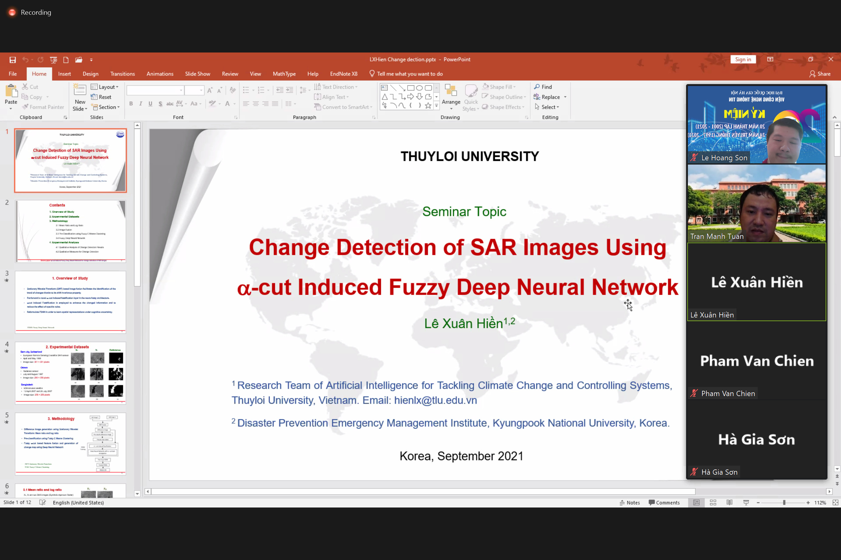 Tương tự, ngày 25/9/2021 nhóm Trí tuệ nhân tạo cho biến đổi khí hậu và điều khiển hệ thống (Artificial Intelligence for Tackling Climate Change and Controlling System – AICOST) đã trình bày 02 bài tham luận về: (1) Change Detection Based on Artificial Intelligence: State of the Art and Challenges (do ThS. Kiều Tuấn Dũng trình bày); (2) Change Detection of SAR Images Using α-cut induced Fuzzy Deep Neural Network (do TS. Lê Xuân Hiền trình bày). Các bài tham luận trình bày về phương pháp học máy trong dự báo lượng mưa từ dữ liệu radar. Trong đó, sử dụng phương pháp Fuzzy Deep Neural Network để phát hiện sự thay đổi hình ảnh đối tượng trên ảnh. Từ những thay đổi phát hiện sẽ phân tích để dự báo lượng mưa dựa trên ảnh radar.