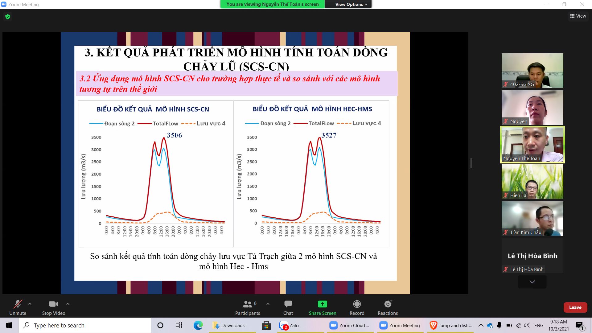 Ngày 03/10/2021 nhóm Ứng dụng GIS và viễn thám (GIS and Remote sensing Application – GRAT) đã trình bày bài tham luận về “Ứng dụng phần mềm SCS-CN trong tính toán mưa rào – dòng chảy” (do NCS. Nguyễn Thế Toàn trình bày). Để kiểm định tính chính xác của mô hình, nhóm nghiên cứu đã so sánh kết quả tính toán của mô hình SCS-CN với kết quả của mô hình HEC HMS. Việc kiểm định được thực hiện với 2 trường hợp điển hình là Lưu vực Nâm Ly 1 và Lưu vực Tả Trạch.