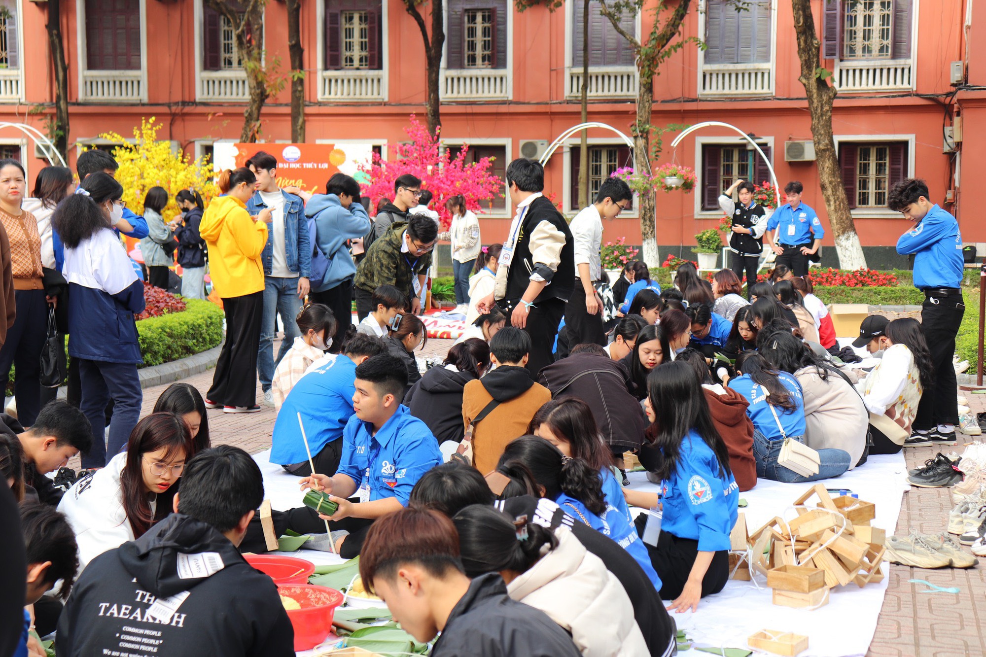 Các em học sinh tham gia trải nghiệm gói bánh chưng tại ngày hội Open Day.