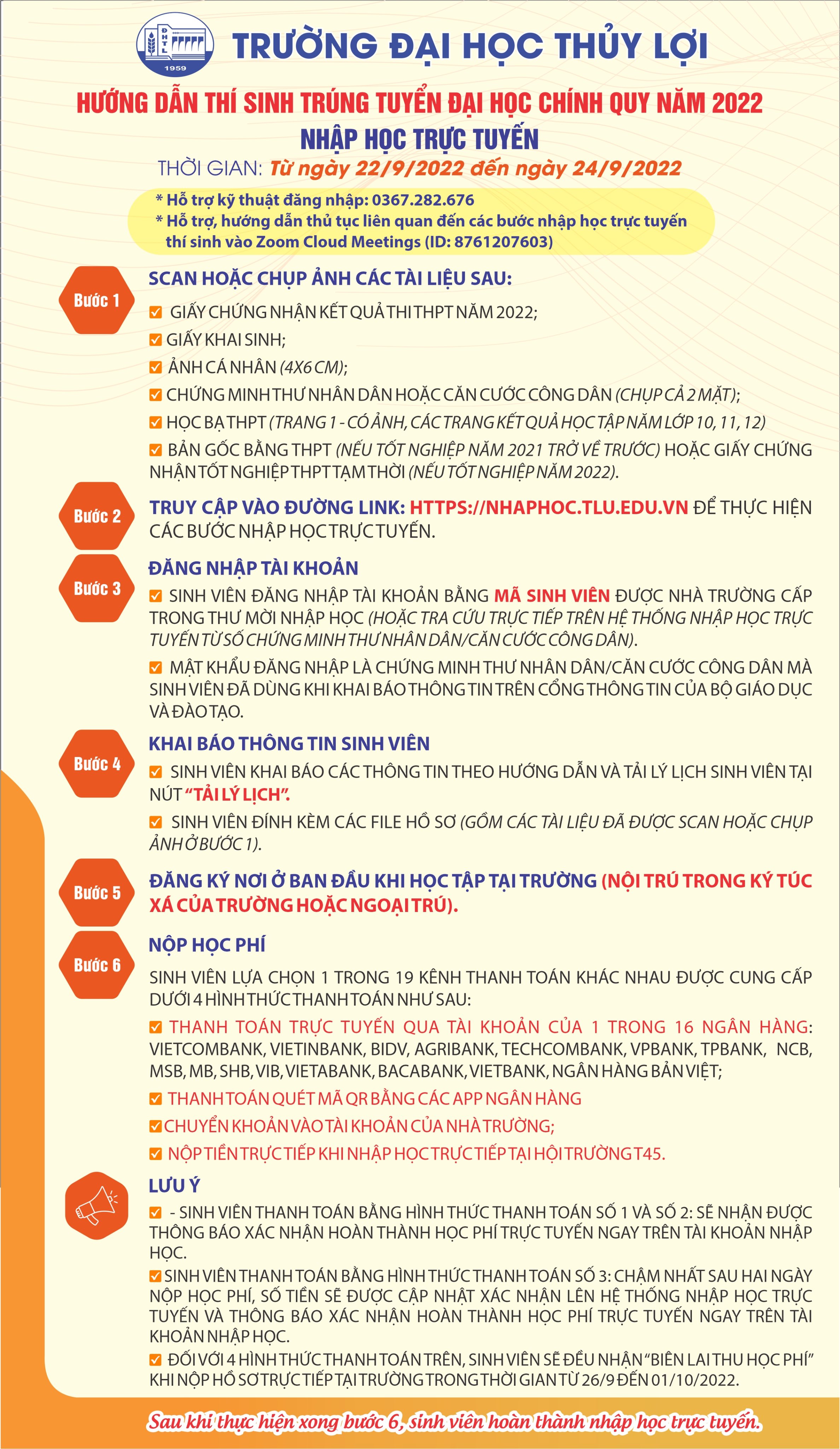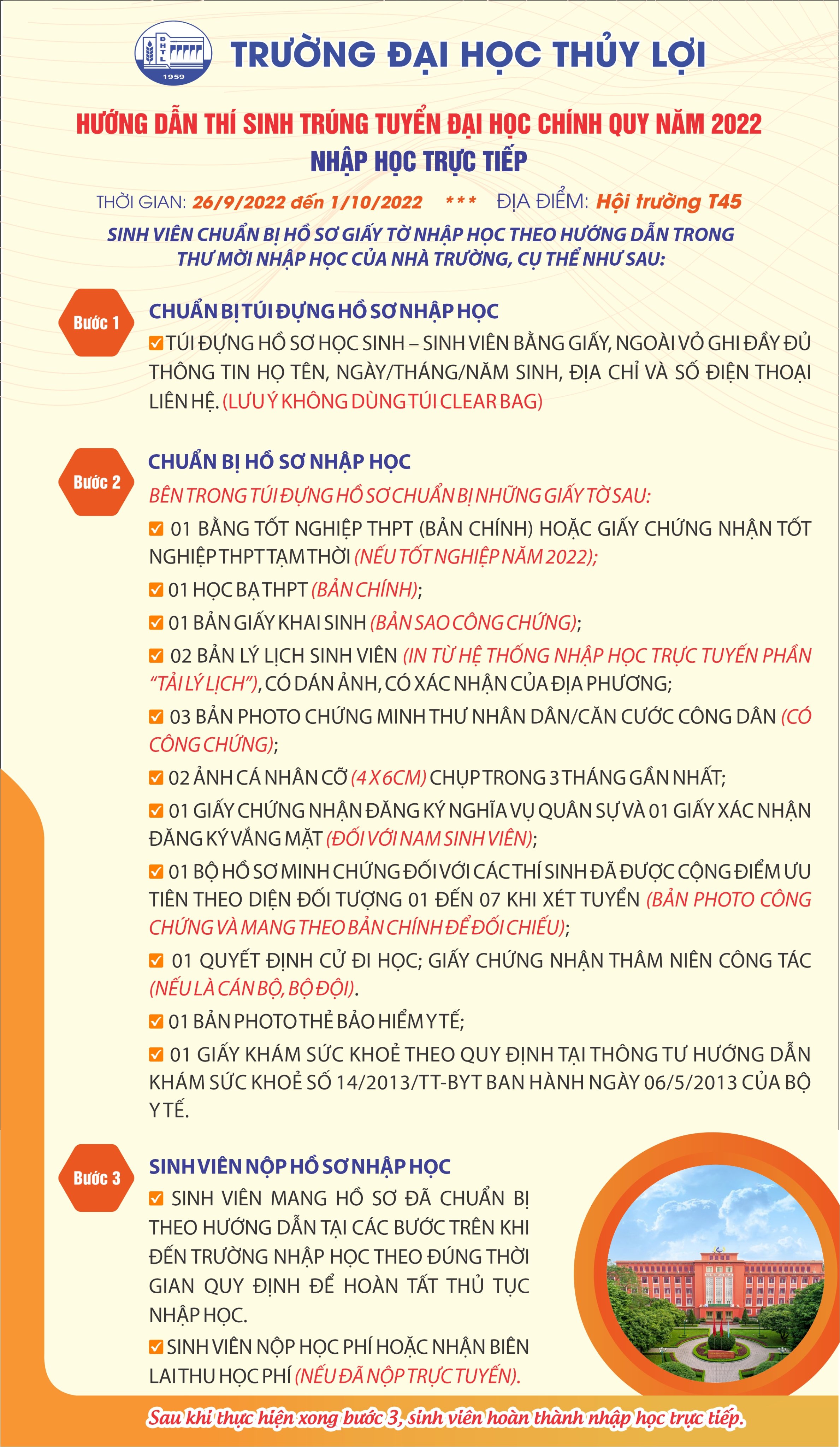 Hướng dẫn thí sinh trúng tuyển đại học chính quy năm 2022 nhập học trực tiếp và trực tuyến vào Trường Đại học Thủy lợi Đăng vào 16 Tháng 9, 2022 bởi Data OldTheo Dõi Trường Đại Học Thủy Lợi Trên * Dành cho thí sinh nhập học trực tuyếnVideo chi tiết: * Dành cho thí sinh nhập học trực tiếp Nâng cao chất lượng đào tạo, kết hợp lý thuyết với thực hànhLịch học tuần đầu khóa dành cho tân sinh viên Khóa 64 Bài viết cùng chủ đề: Trường Đại học Thủy lợi triển khai nhiệm vụ năm học 2025–2026: Tăng cường đổi mới, nâng cao chất lượng đào tạo trong bối cảnh mới Phương và hành trình vươn tới ước mơ Trường Đại học Thủy lợi tiếp đón đoàn doanh nghiệp tỉnh Ehime (Nhật Bản) Kế hoạch bổ nhiệm, bổ nhiệm lại chức danh Giáo sư, Phó giáo sư năm 2025 Đại học Thủy lợi thắng thuyết phục 2–0, hiên ngang tiến vào bán kết NUC Cup TV360 Trường Đại học Thủy lợi tiếp tục thúc đẩy các nghiên cứu khuôn khổ dự án Mekong Delta Living Lab với Đại học Công nghệ Delft (TU- Delft, Hà Lan) Đội tuyển bóng đá giành 9 điểm tuyệt đối, hiên ngang tiến vào Top 8 đội mạnh nhất toàn quốc Nghiên cứu xây dựng bộ công cụ phục vụ đánh giá, dự báo biến động hình thái và giải pháp ổn định bãi biển vùng Trung Trung Bộ