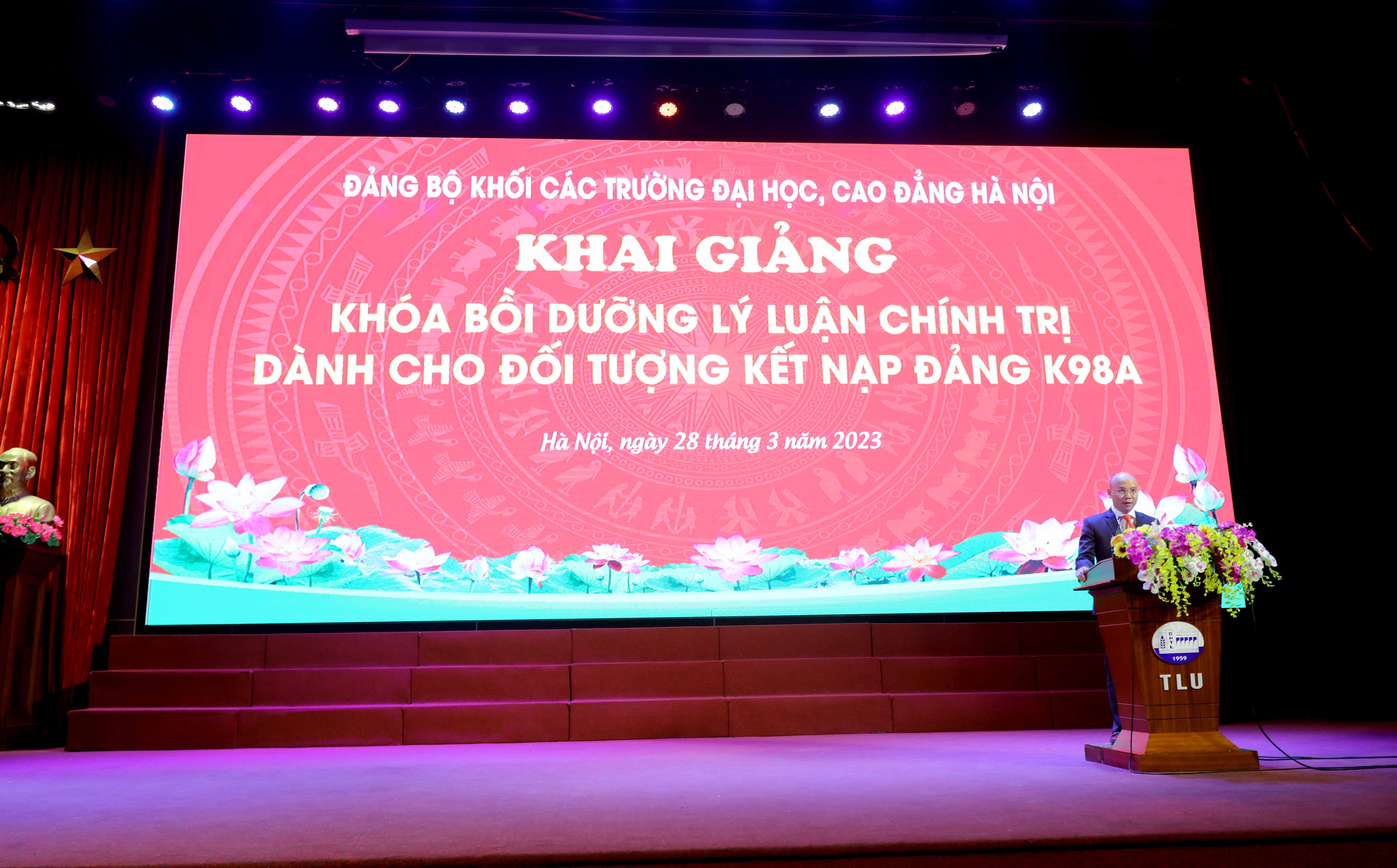 Phát biểu khai giảng, PGS.TS Nguyễn Hữu Huế, Bí thư Đảng ủy, Chủ tịch Hội đồng Trường khẳng định, công tác tạo nguồn và phát triển đảng viên luôn được Đảng ủy khối các trường Đại học, cao đẳng Hà Nội nói chung và đảng bộ các Trường nói riêng đặc biệt quan tâm, coi đây là nhiệm vụ chính trị quan trọng. Việc kết nạp những thanh niên ưu tú vào Đảng không chỉ góp phần “trẻ hóa” đội ngũ đảng viên mà còn tạo động lực để các bạn trẻ phấn đấu, góp phần tạo nguồn nhân lực tương lai có trình độ chuyên môn cao, phẩm chất chính trị vững vàng, đáp ứng yêu cầu xây dựng và bảo vệ Tổ quốc trong thời kỳ công nghiệp hóa – hiện đại hóa.