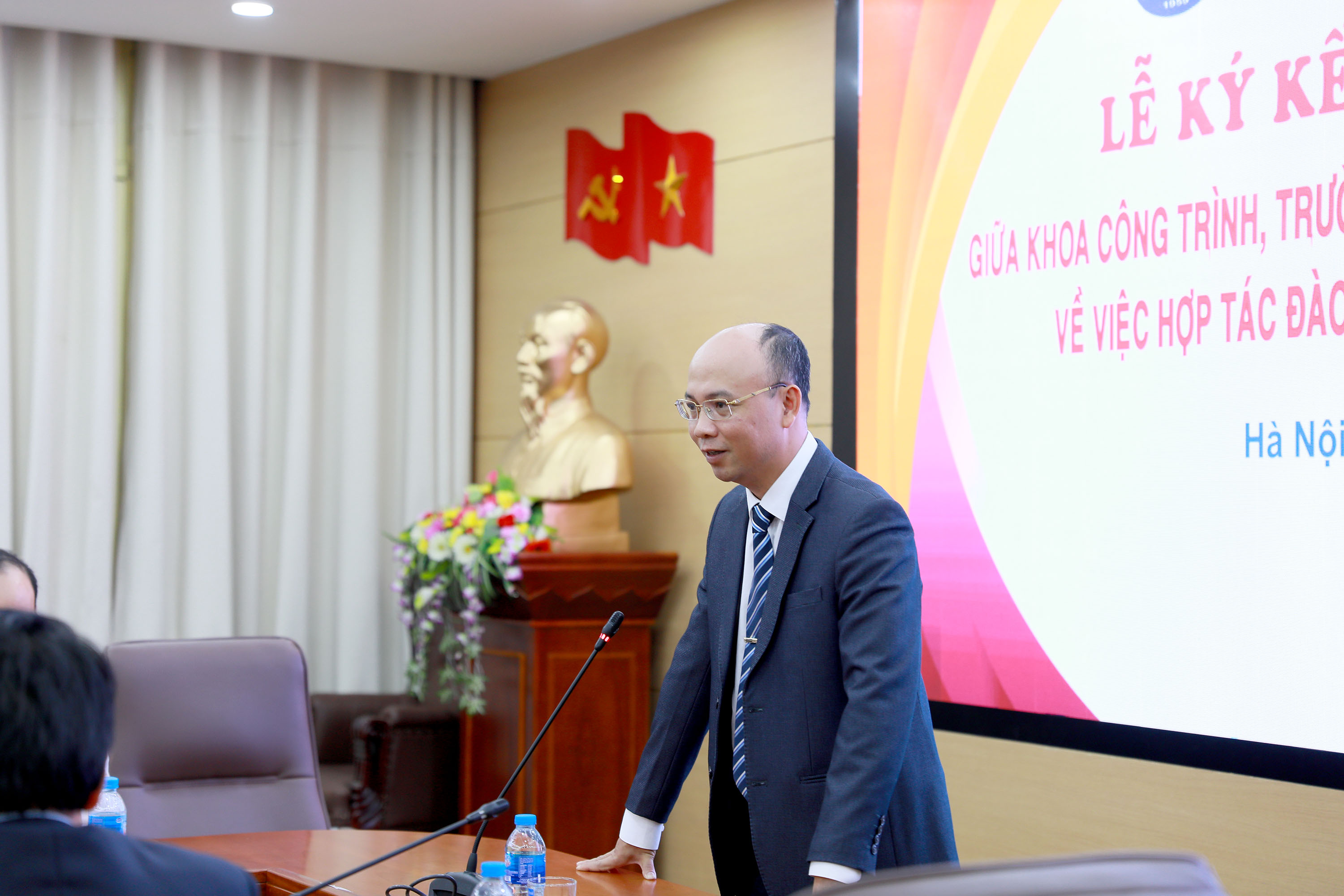 Buổi lễ có sự tham dự của ông Lê Thế Hùng – Phó Tổng giám đốc Công ty VIMECO cùng trưởng, phó các đơn vị trực thuộc công ty. Về phía Trường Đại học Thủy lợi có GS. TS Trịnh Minh Thụ – Hiệu trưởng, GS.TS Nguyễn Trung Việt – Phó hiệu trưởng; đại diện lãnh đạo các Phòng chức năng cùng các cán bộ, giảng viên, sinh viên Khoa Công trình.
