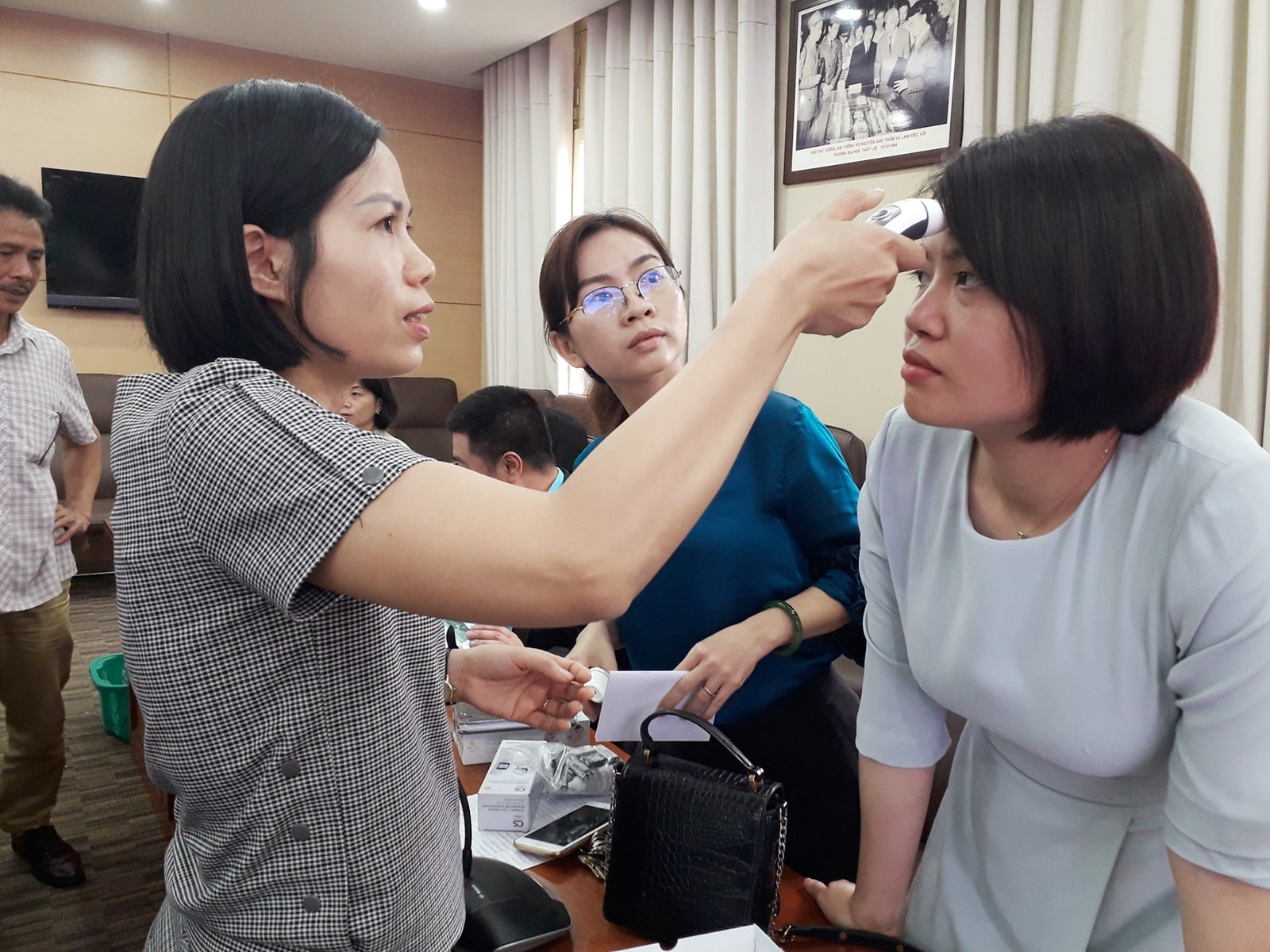 Nữ cán bộ y tế tập huấn cho các thầy cô kiểm tra thân nhiệt khi sinh viên trở lại học tập