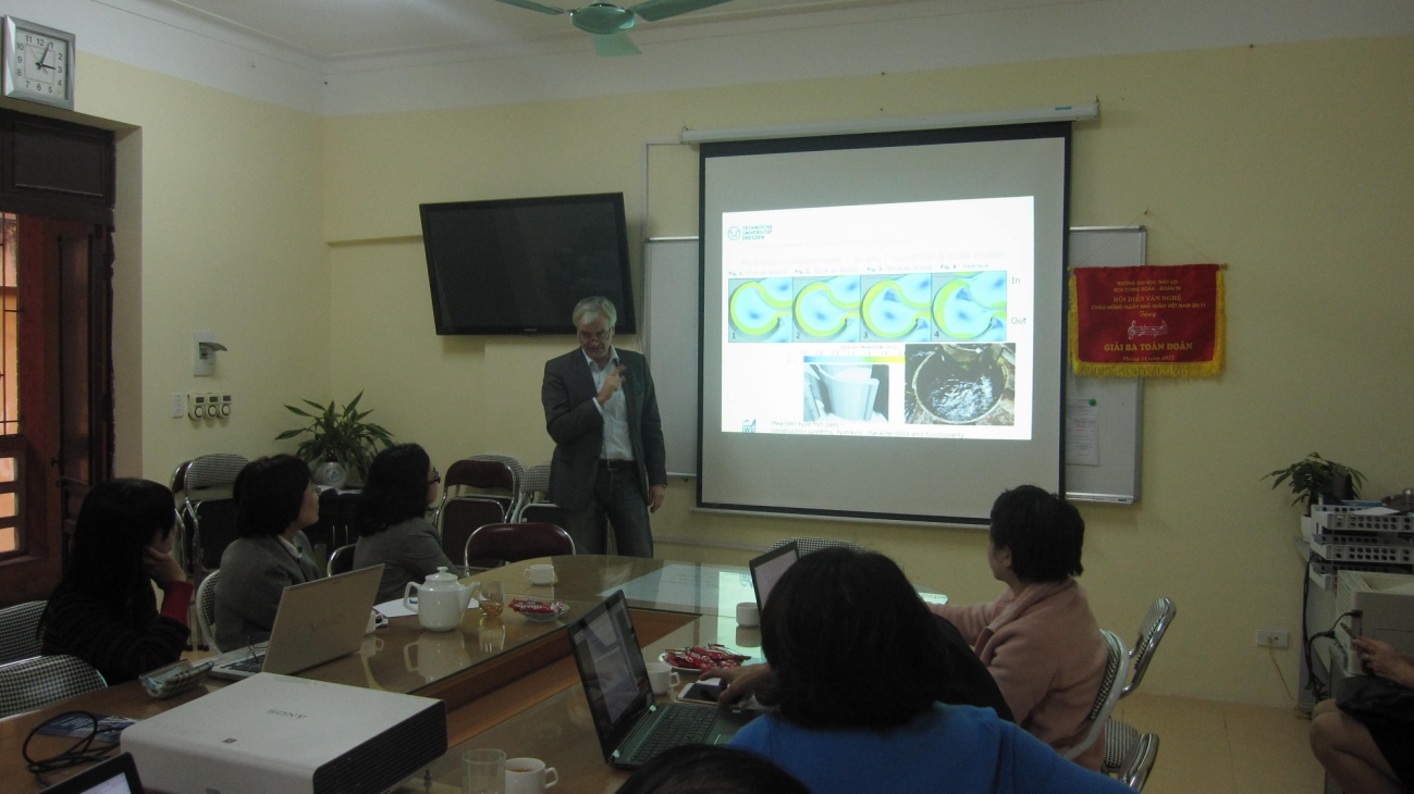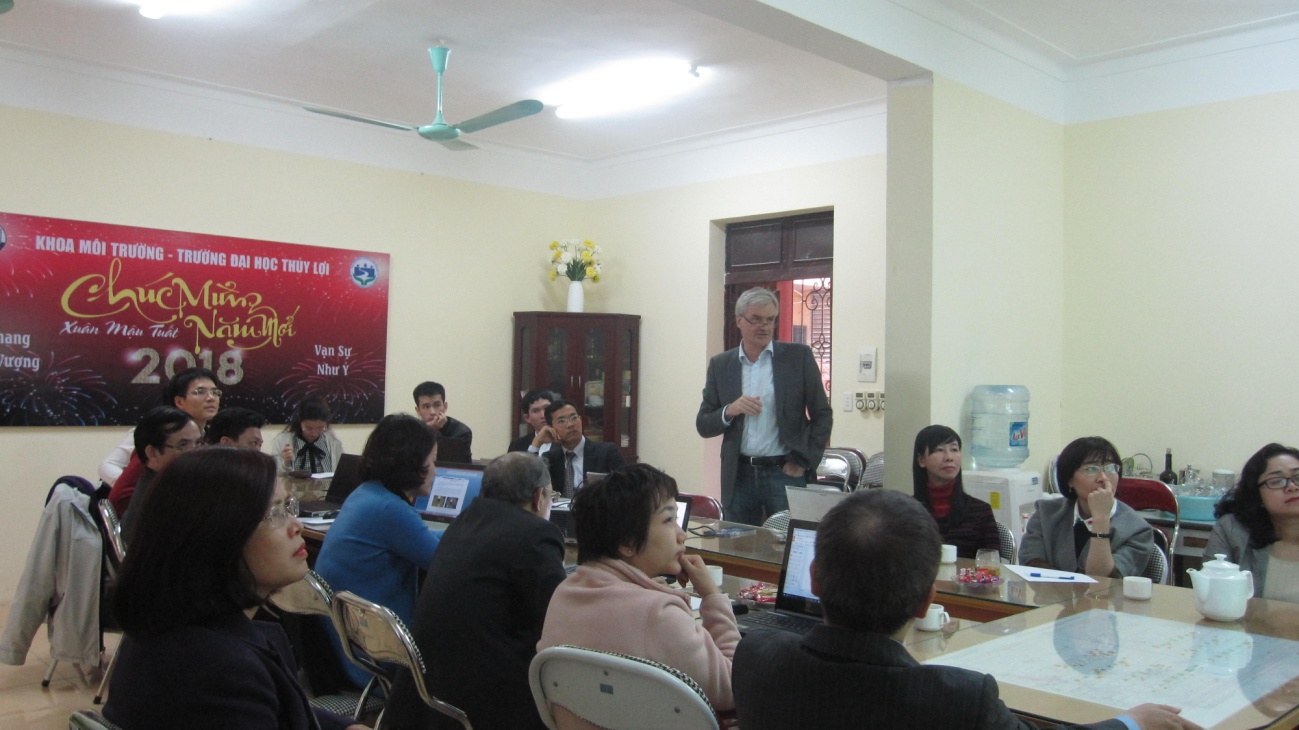 Trước khi trình bày báo cáo, GS.TS Juergen Stamm đã phát biểu cảm ơn sự đón tiếp nồng hậu của Khoa Môi trường và trường Đại học Thủy lợi đã dành cho GS. Ông cũng hy vọng rằng sẽ có thể thiết lập được các mối quan hệ hợp tác hiệu quả với Khoa và Trường ĐHTL trong tương lai.