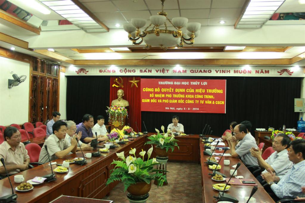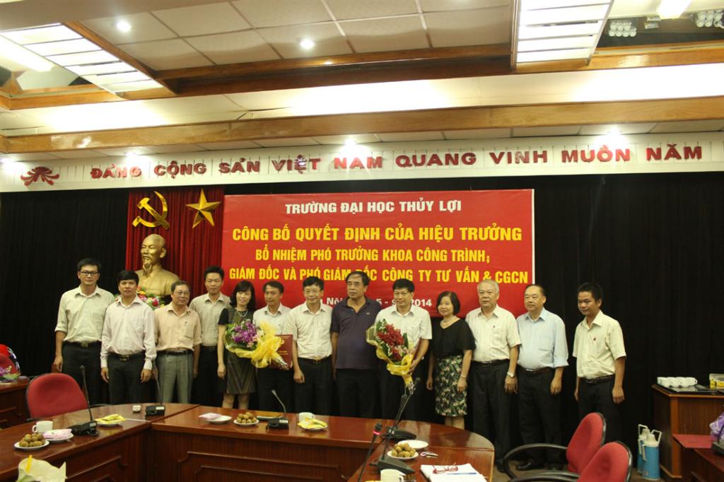 Ngày 5/9/2014, tại hội trường 223, trường ĐH Thủy Lợi đã long trọng tổ chức Lễ bổ nhiệm Phó trưởng khoa Công trình cho PGS.TS Nguyễn Tiến Chương, Giảng viên chính, Trưởng Bộ môn Xây dựng dân dụng và công nghiệp; bổ nhiệm Giám đốc công ty Tư vấn và Chuyển giao công nghệ cho ThS Phạm Cao Tuyến nguyên Phó giám đốc Công ty Tư vấn và chuyển giao công nghệ Trường Đại học Thủy lợi và bổ nhiệm Phó giám đốc công ty Tư vấn và Chuyển giao công nghệ cho ThS Nguyễn Văn Chính, Giám đốc Xí nghiệp Thiết kế 2 trực thuộc Công ty Tư vấn và chuyển giao công nghệ. Tham dự có GS.TS Nguyễn Quang Kim – Hiệu trưởng Nhà trường, các thầy trong Ban giám hiệu, Đảng ủy Nhà trường cùng đại diện các phòng, khoa, ban trong trường.