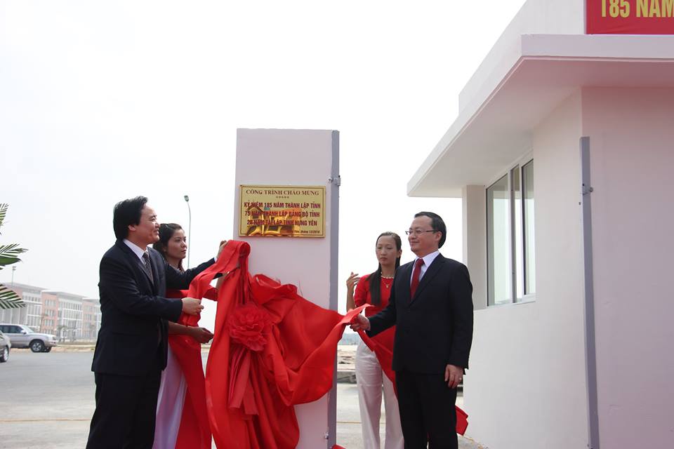 Ngay sau phần báo cáo khái quát về quá trình triển khai dự án mở rộng trường, GS.TS Phùng Xuân Nhạ – Ủy viên Trung Ương Đảng Bộ trưởng Bộ Giáo dục & Đào tại và Ông Đỗ Tiến Sỹ – Ủy viên Trung Ương Đảng, Bí thư Tỉnh ủy, trưởng đoàn Đại biểu Quốc hội tỉnh Hưng Yên đã tiến hành thực hiện nghi lễ gắn biển công trình chào mừng 185 năm thành lập tỉnh Hưng Yên, 75 năm thành lập Đảng bộ Tỉnh và 20 năm ngày tái lập tỉnh Hưng Yên.