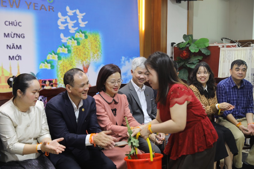 Thầy Phó hiệu trưởng và Bà Phonevilay SYPASEUTH – Bí thư thứ Hai Đại sứ quán Lào tại Việt Nam cũng rất hào hứng với điệu nhảy Lăm vông cùng với các bạn Lưu học sinh nước bạn Lào anh em.