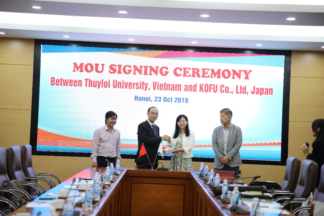 Để tạo tiền đề cho việc thúc đẩy các hợp tác sau này giữa Nhà trường và Công ty KOFU, sáng ngày 23/10/2018, Trường Đại học Thủy lợi đã tổ chức Lễ ký biên bản ghi nhớ (MOU) với Công ty TNHH KOFU Nhật Bản với sự chứng kiến của đại diện CS2, Đại học Thủy lợi, TP Hồ Chí Minh và đại diện Tổ chức xúc tiến thương mại Nhật Bản JETRO tại Hà Nội. Tham dự buổi lễ, bên phía công ty KOFU gồm có Bà Mizuho GOTO – Chủ tịch, Bà Yuko KIMURA – Trưởng ban đối ngoại, bên phía Tổ chức JETRO gồm có Ông Hironobu KITAGAWA – Trưởng đại diện JETRO tại Việt Nam và Ông Kenji Fushihara. Về phía Trường Đại học Thủy lợi có GS. TS Trịnh Minh Thụ – Hiệu Trưởng, PGS.TS. Triệu Ánh Ngọc – Giám đốc Trung tâm Tư vấn và Nghiên cứu thực nghiệm, Cơ sở 2 – Đại học Thủy Lợi tại TP. Hồ Chí Minh cùng đại diện các đơn vị liên quan trong trường.