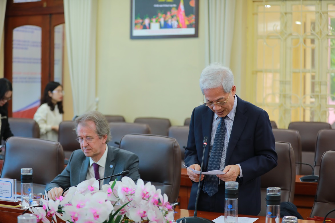 Ông Philippe Gourbesville – Chủ tịch IAHR đã bày tỏ sự vui mừng khi được hợp tác với TLU và VWRA. Ông Philippe giới thiệu về IAHR, các hoạt động, hợp tác, mạng lưới toàn cầu và mong muốn được kết nối với các nhà khoa học Việt Nam để cùng giải quyết những vấn đề môi trường toàn cầu. Ông Philippe cũng nhắc qua những hoạt động hợp tác với các nước trước đây và mong muốn được hợp tác với Việt Nam.