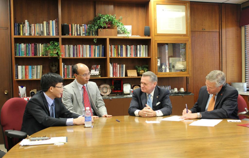 Từ trái sang: Hiệu trưởng trường Đại học Thủy Lợi GS. TS. Nguyễn Quang Kim, trưởng khoa Công trình PGS. TS. Nguyễn Hữu Huế ký kết văn bản thỏa thuận chương trình đào Bsc. E 2+2 với GS. G. David Gearhart, Hiệu trưởng trường Đại học Arkansas và GS. John English, hiệu trưởng trường Đại học Kỹ thuật trực thuộc Đại học Arkansas.