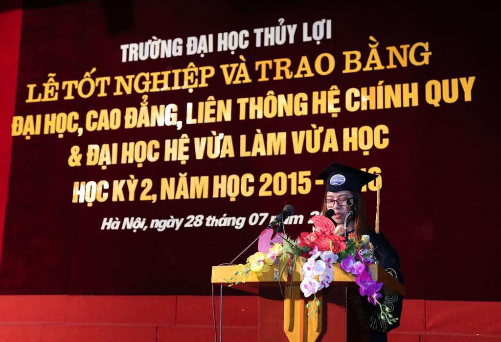 Sinh viên Lê Nguyễn Thu Anh – lớp 54K-PT, Khoa Kinh tế và Quản lý, xếp loại tốt nghiệp xuất sắc, thay mặt cho đông đảo các tân kỹ sư, tân cử nhân tốt nghiệp học kì II năm học 2015 – 2016, đã gửi lời cảm ơn sâu sắc tới Ban giám hiệu, các giảng viên của trường đã luôn quan tâm, giúp đỡ, tạo điều kiện cho sinh viên hoàn thành tốt chương trình học của mình.