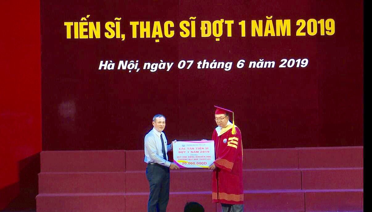 Cũng nhân dịp này, ông Vinvilay Sayaphone – hiện đang là cán bộ của Bộ Nông Lâm nghiêp Lào, người có nhiều gắn bó với Trường Đại học Thủy lợi, đã học tập tại Trường từ bậc đại học, cao học và NCS thay mặt cho 6 tân tiến sĩ được cấp bằng dịp này trao tặng quỹ học bổng khuyến học của Nhà trường 20 triệu đồng.