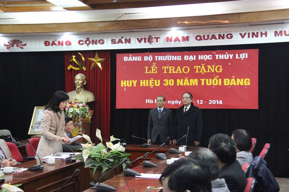 Trường Đại học Thủy lợi đã trải qua 55 năm xây dựng và trưởng thành, cùng với đó đã ghi nhận những đóng góp của các đồng chí Đảng viên qua nhiều thế hệ, đã từng học tập và công tác tại trường đối với sự phát triển của Đảng bộ trường Đại học Thủy lợi. Với mục đích ghi nhận những đóng góp tích cực và đánh dấu thành tích của các đồng chí Đảng viên trong trường ngày 26-12-2014 vừa qua, tại phòng 223 nhà A1, Đảng bộ trường Đại học Thủy lợi đã long trọng tổ chức lễ trao tặng huy hiệu 30 năm tuổi Đảng cho các đồng chí Đảng viên thuộc Đảng bộ trường.