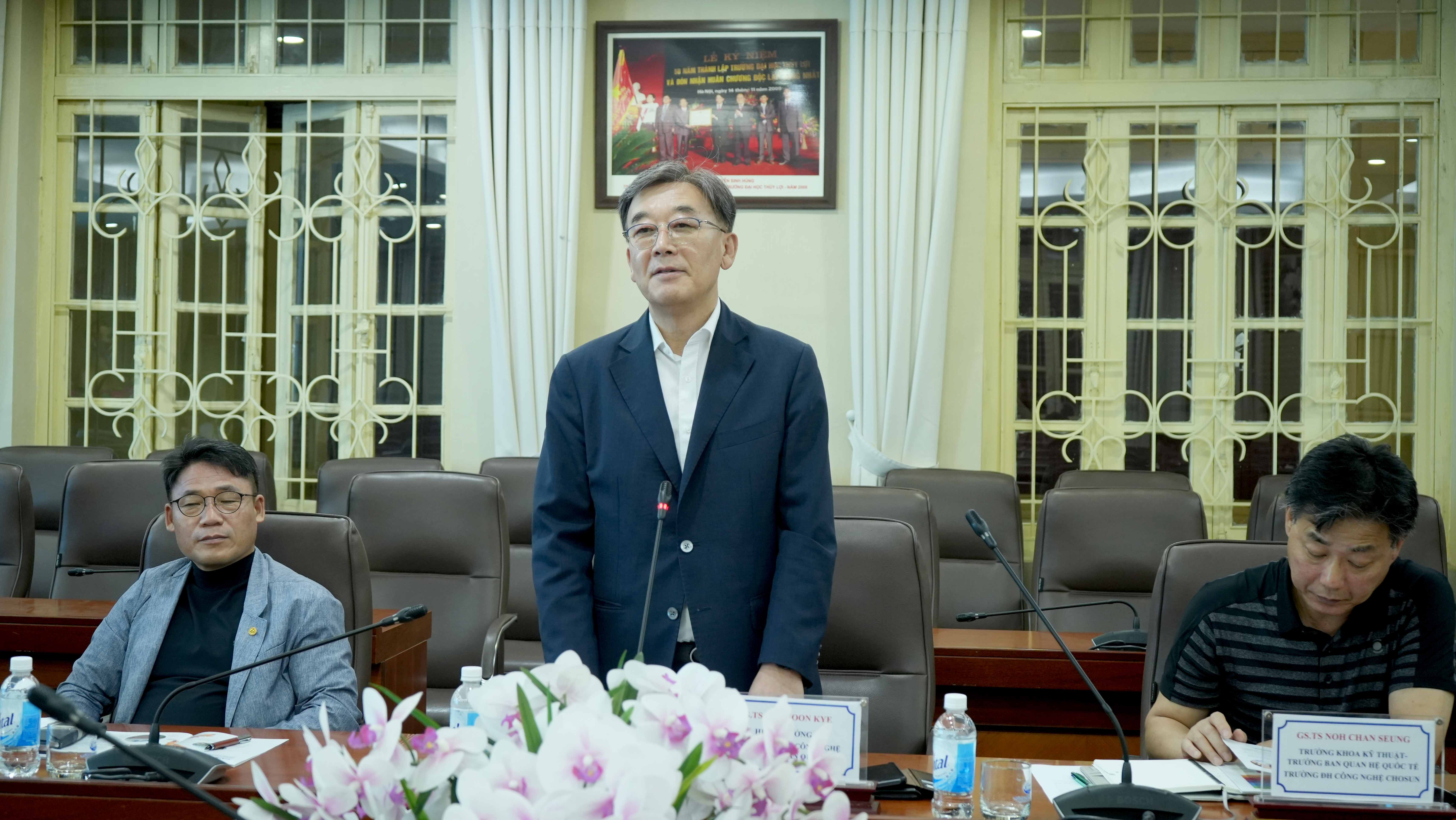 Trong khuôn khổ buổi làm việc, GS.TS Nguyễn Trung Việt – Phó Hiệu trưởng cũng giới thiệu những nét chính về Nhà trường; đồng thời đề xuất hợp tác 3 nội dung hợp tác gồm: (1) Mở trung tâm đào tạo tiếng Hàn và thi sát hạch các chứng chỉ nghề làm việc tại Hàn Quốc, (2) Giới thiệu việc làm tại các doanh nghiệp Hàn Quốc cho các kỹ sư Trường Đại học Thủy lợi thông qua Trung tâm Xúc tiến Công nghiệp Gốc Quốc Gia Hàn Quốc, (3) Hợp tác với Đại học Chosun đào tạo chương trình 1+2 và giới thiệu việc làm cho sinh viên tại các Doanh nghiệp Hàn Quốc.