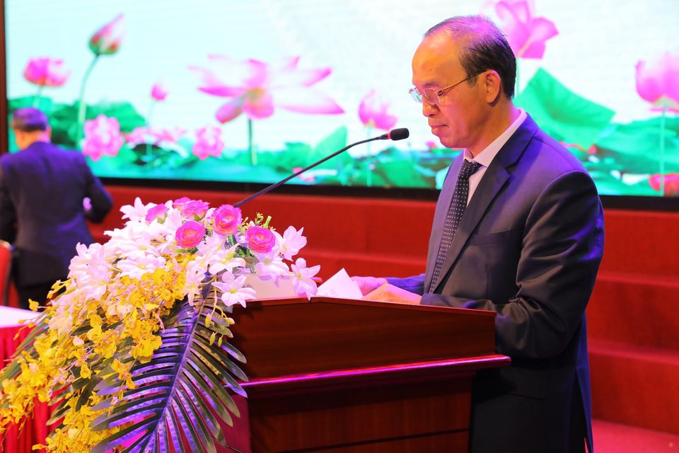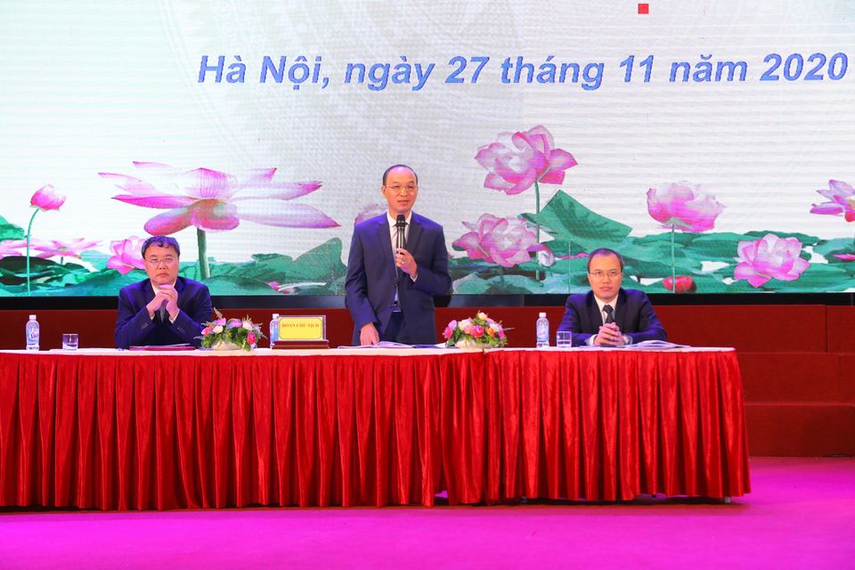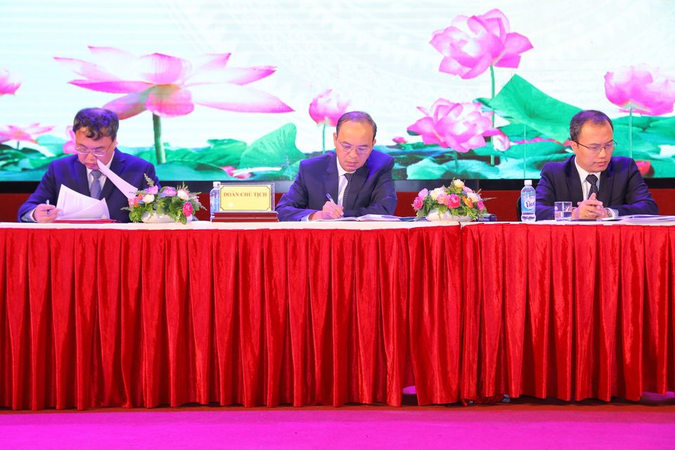 Đoàn chủ tịch (GS.TS Trịnh Minh Thụ, Hiệu trưởng; PGS.TS Nguyễn Cảnh Thái, Phó Hiệu trưởng; PGS.TS Nguyễn Ngọc Thắng, Chủ tịch Công đoàn trường)điều hành Hội nghị