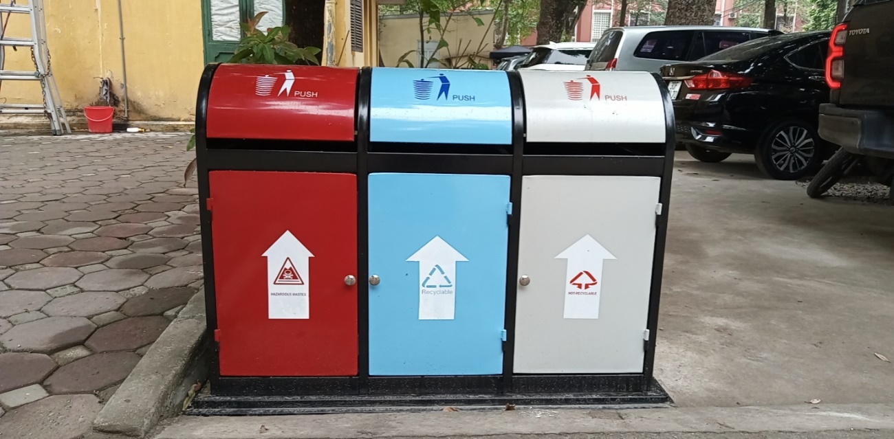 Nhằm nâng cao ý thức về phân loại rác tại nguồn cho sinh viên, giảng viên và cán bộ nhân viên trong trường, Trường Đại học Thủy lợi đã đặt các thùng phân loại rác trong khuôn viên trường. Mỗi thùng rác được chia thành ba khoang sơn màu đỏ, xanh dương, và ghi. Khoang màu đỏ dành cho rác thải nguy hại là chất thải chứa yếu tố độc hại, lây nhiễm, dễ cháy, dễ nổ, gây ăn mòn, gây nhiễm độc hoặc có đặc tính nguy hại khác (theo Luật BVMT 2020). Khoang màu xanh dương để chứa chất thải có khả năng tái chế như chai, lọ thủy tinh, chai, lọ nhựa, bao bì nhựa mềm, hộp giấy, giấy viết, giấy in, bìa carton, phế liệu… Khoang màu ghi chứa các loại rác không thể tái chế được như các sản phẩm đồ giấy dùng một lần: cốc giấy, hộp bìa cán nilon, xương động vật, vỏ sò, vỏ hến….