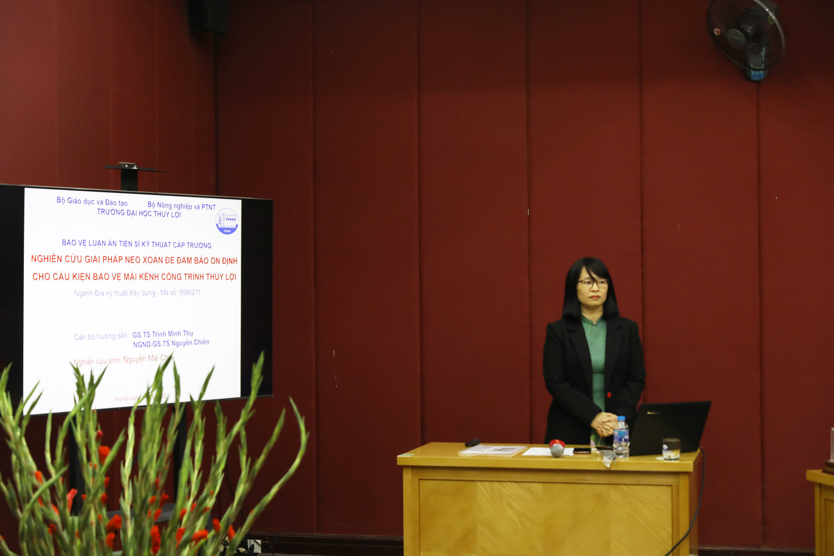 NCS Nguyễn Mai Chi bảo vệ uận án tiến sĩ cấp Trường với Đề tài: Nghiên cứu giải pháp neo xoắn để gia cường ổn định cho cấu kiện bảo vệ mái kênh công trình thủy lợi, Ngành: Địa kỹ thuật xây dựng, Mã số: 9580211. Người hướng dẫn khoa học: GS.TS. Trịnh Minh Thụ; GS.TS. Nguyễn Chiến.