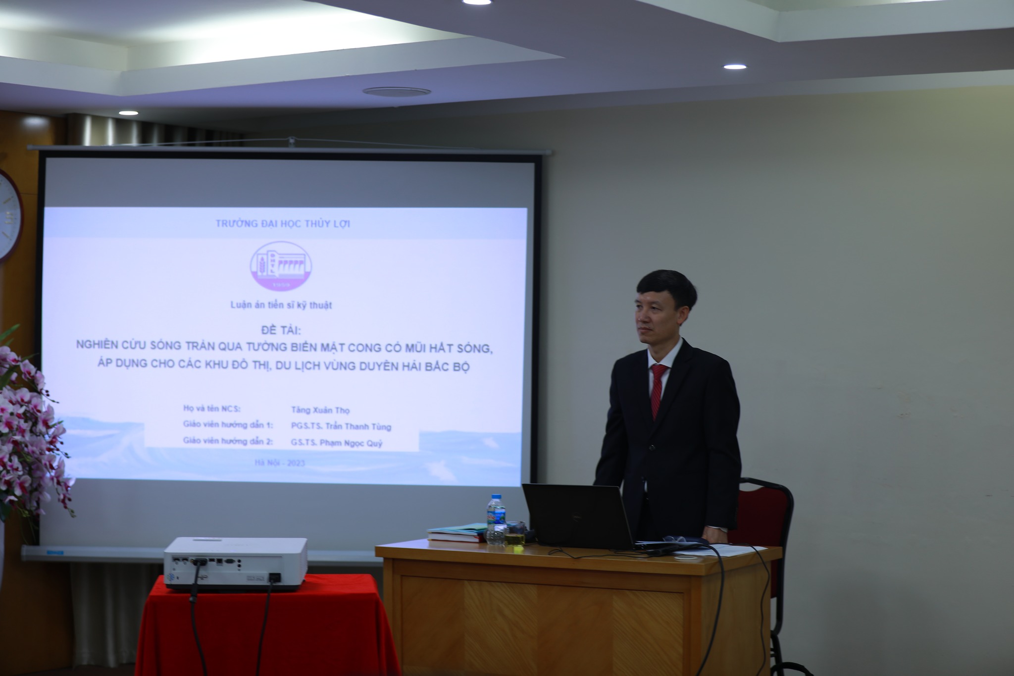 NCS Tăng Xuân Thọ Nghiên cứu sóng tràn qua tường biển mặt cong có mũi hắt sóng, áp dụng cho các khu đô thị, du lịch vùng duyên hải Bắc Bộ, Ngành Kỹ thuật xây dựng công trình biển; Mã số: 9580203; Người hướng dẫn khoa học: PGS.TS. Trần Thanh Tùng; GS.TS. Phạm Ngọc Quý.