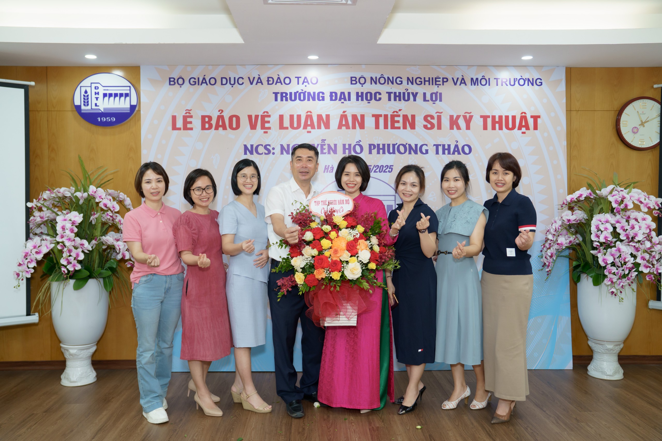 Bạn bè, đồng nghiệp và gia đình chúc mừng NCS hoàn thành bảo vệ luận án tiến sĩ cấp trường.