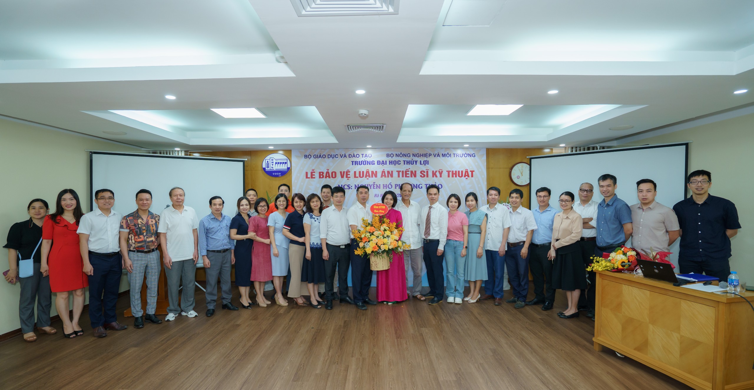 Bạn bè, đồng nghiệp và gia đình chúc mừng NCS hoàn thành bảo vệ luận án tiến sĩ cấp trường.