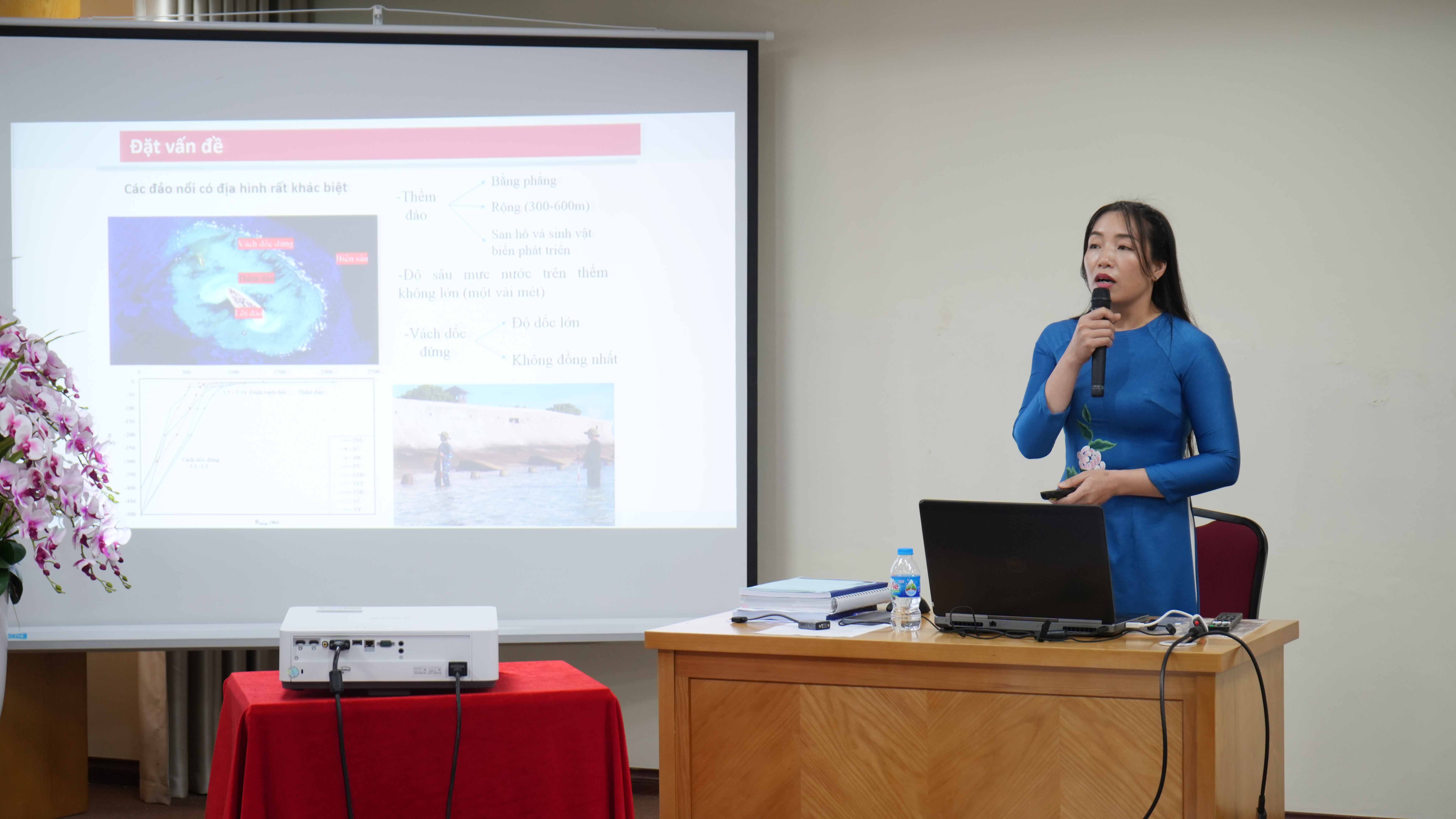 Các đảo nổi xa bờ có địa hình rất khác biệt với vách dốc đứng thay đổi gấp từ nơi có độ sâu hàng trăm mét đến thềm nông một vài mét, tiếp nối đó là một thềm san hô phẳng với diện tích khá rộng kéo dài vào lõi đảo. Phần lõi đảo có diện tích rất nhỏ, lại luôn có nguy cơ bị bào mòn do phải chịu tác động rất khốc liệt của các hiện tượng xâm thực tự nhiên. Bên cạnh xói lở thì ở hầu hết các đảo nổi còn có sự xuất hiện của những doi cát khá lớn được bồi tụ trên thềm, những doi cát này luôn có một phần di chuyển xung quanh lõi đảo theo mùa sóng gió. Cùng với đó, các hoạt động của con người gây ô nhiễm môi trường dẫn tới sự phá hủy của các quần thể sinh vật trên vùng đảo ngập và mức độ tự phục hồi khá chậm. Xuất phát từ yêu cầu thực tiễn là phải có giải pháp đối với các vấn đề trên đảo nổi và giải pháp công trình được lựa chọn là kết cấu ngầm rỗng Reef BallTM. Nghiên cứu sóng truyền qua công trình có kết cấu rỗng trên thềm đảo nổi với những đặc trưng thủy động lực sóng có tính đặc thù là một nội dung mang tính khoa học và thực tiễn, đây là một vấn đề nghiên cứu mới. Cùng với đó, kết cấu ngầm giảm sóng xa bờ sử dụng hệ thống các cấu kiện bê tông rỗng Reef BallTM được bố trí không gian trên thềm đảo để tạo độ rỗng chủ động cũng là một đề xuất mới cần được nghiên cứu, đánh giá. Với ý nghĩa đó NCS Phạm Thị Thúy đã lựa chọn đề tài “Nghiên cứu hiệu quả giảm sóng của kết cấu ngầm Reef BallTM trên thềm đảo nổi xa bờ”