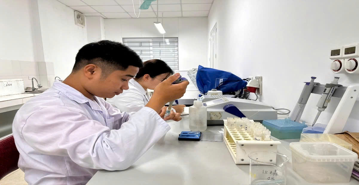Sinh viên lớp 65CNSH1 thực hiện thí nghiệm tại Phòng thí nghiệm Công nghệ sinh học