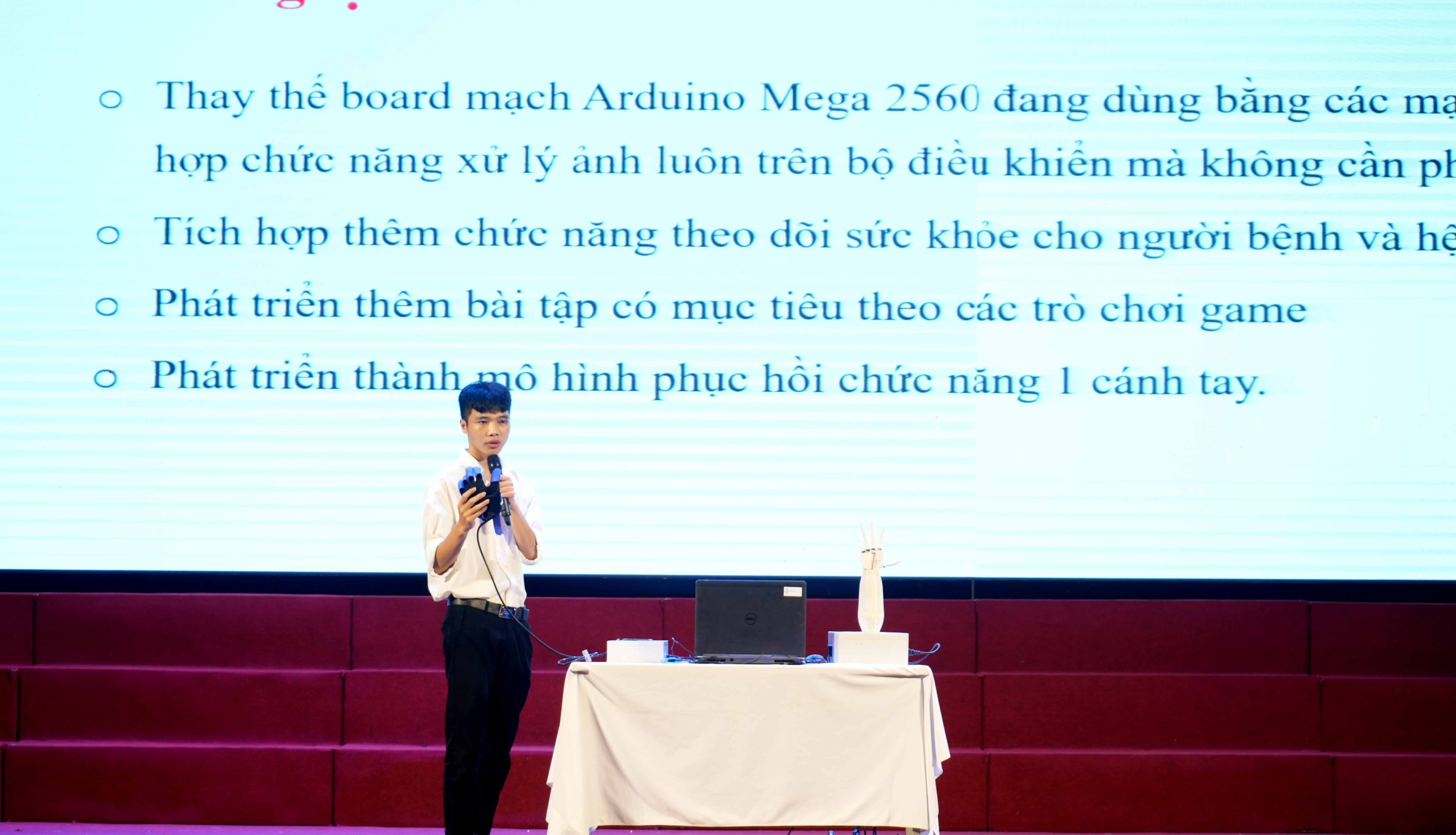 Sinh viên Dương Văn Vũ, lớp TĐH1, Khoa Điện – Điện tử trình bày đề tài đạt giải Nhất mang tên: Nghiên cứu thiết kế mô hình bàn tay robot để phục hồi chức năng cho bệnh nhân liệt 1 bàn tay