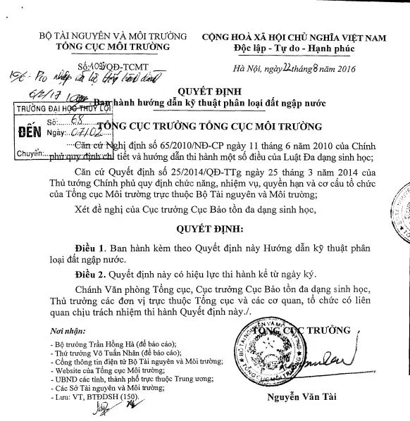 Quyết định ban hành hướng dẫn phân loại đất ngập nước