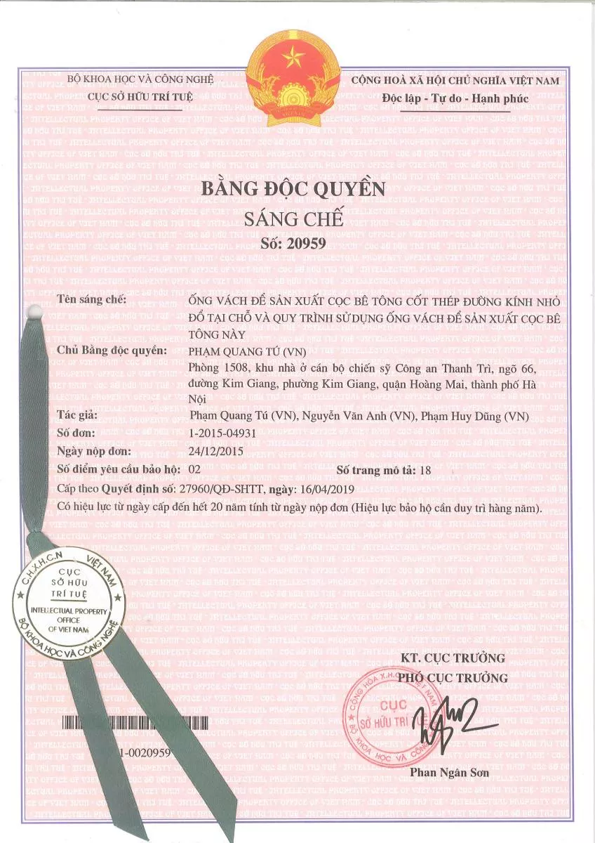 Bằng Độc quyền sáng chế số 20959 cấp theo Quyết định số 27960/QĐ-SHTT, ngày 16/4/2019 và được công nhận cho các chủ bằng: 1. Phạm Quang Tú (VN) Bộ môn Địa kỹ thuật -Trường Đại học Thủy lợi, 175 Tây Sơn, quận Đống Đa, thành phố Hà Nội 2. Nguyễn Văn Anh (VN) 3. Phạm Huy Dũng (VN) Bộ môn Địa kỹ thuật -Trường Đại học Thủy lợi, 175 Tây Sơn, quận Đống Đa, thành phố Hà Nội Ưu điểm của sáng chế: Giải pháp xử lý nền bằng cọc BT đường kính nhỏ đổ tại chỗ đã được Cục...