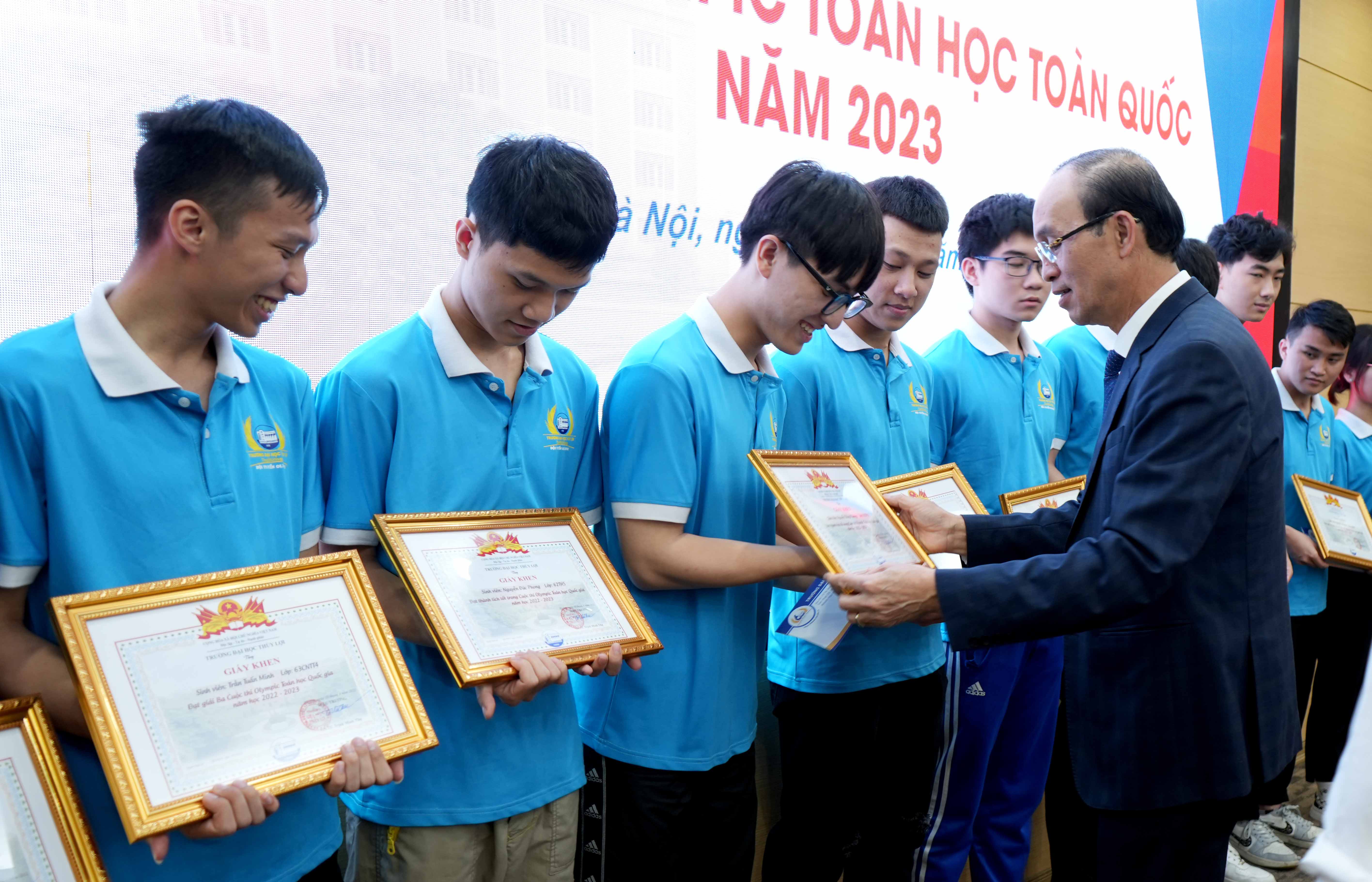 Lãnh đạo Nhà trường tặng giấy khen cho các thành viên đội tuyển Olympic Toán học