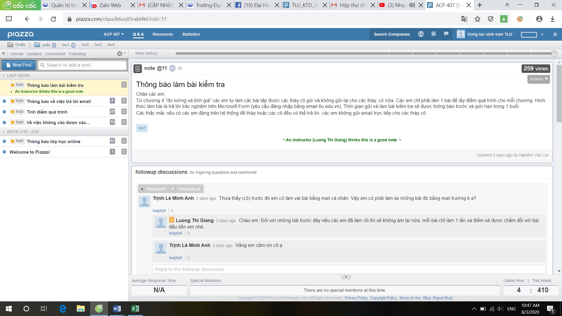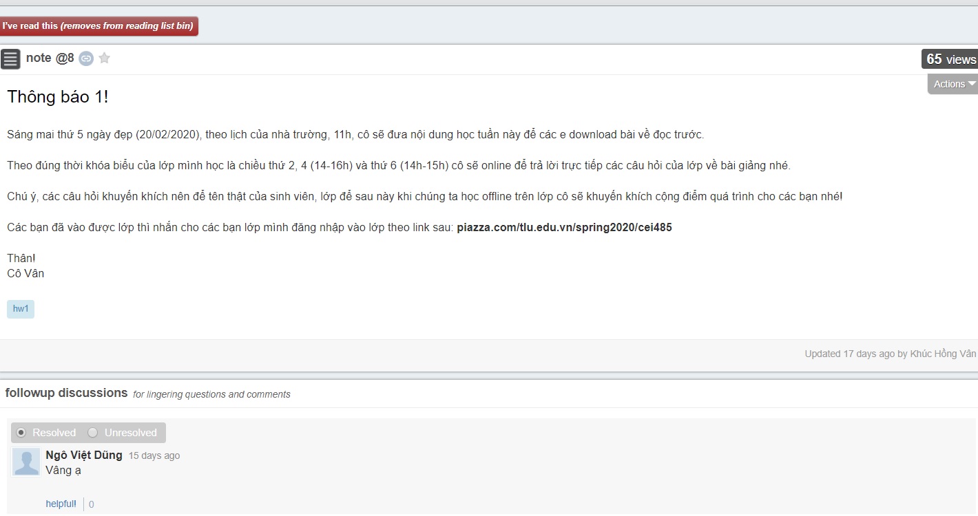 Thông báo của một lớp học trực tuyến trên nền tảng học trực tuyến Piazaa