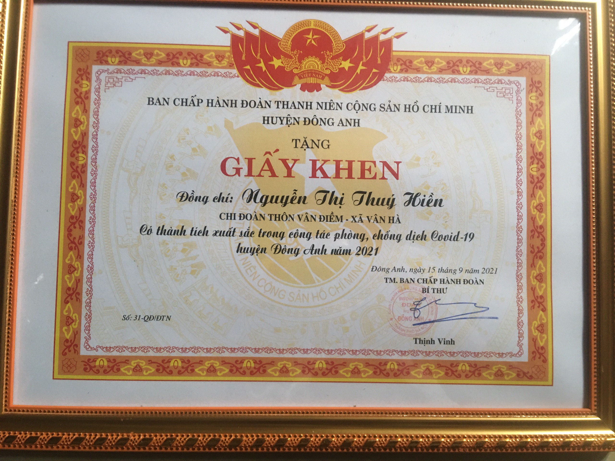 Thúy Hiền nhận khen thưởng có thành tích xuất sắc trong công tác chống dịch Covid-19 tại huyện Đông Anh