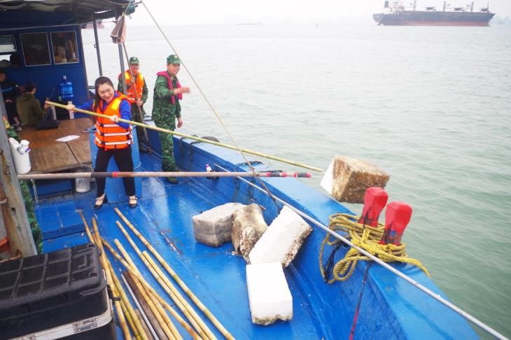 Cán bộ Hải đội Biên phòng 2 BĐBP Quảng Ninh cùng đoàn viên thanh niên địa phương thu gom rác thải nhựa, phao xốp từ hoạt động nuôi trồng thủy sản trên biển thành phố Hạ Long, tỉnh Quảng Ninh. Ảnh: Internet