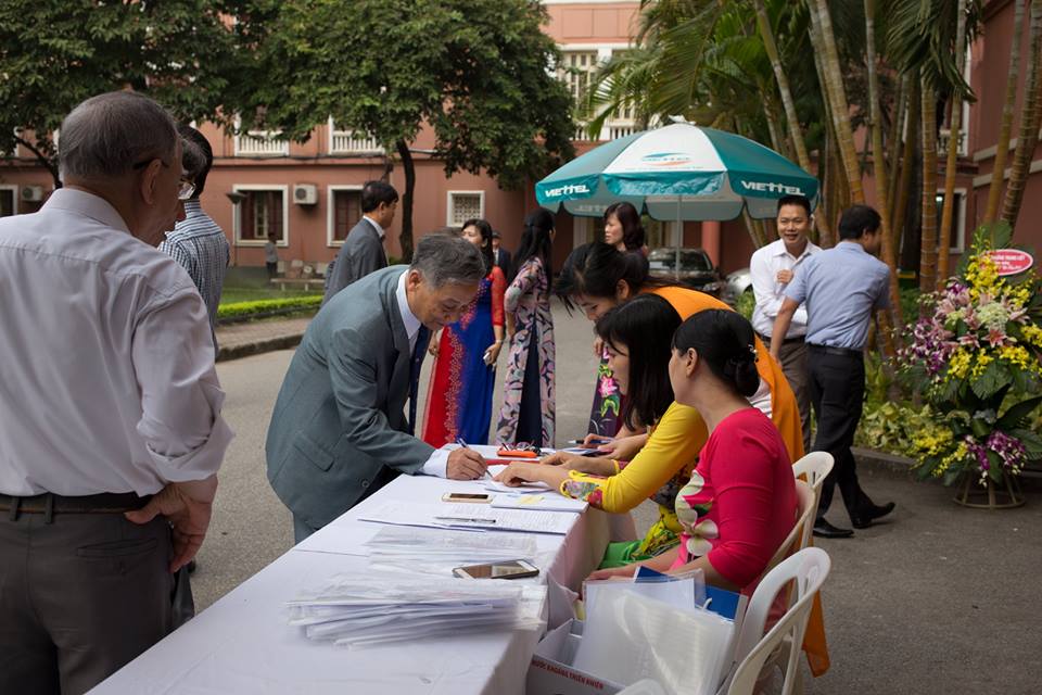 Nơi bàn đón tiếp đại biểu đến tham dự buổi lễ được tổ chức tại Hội trường T45