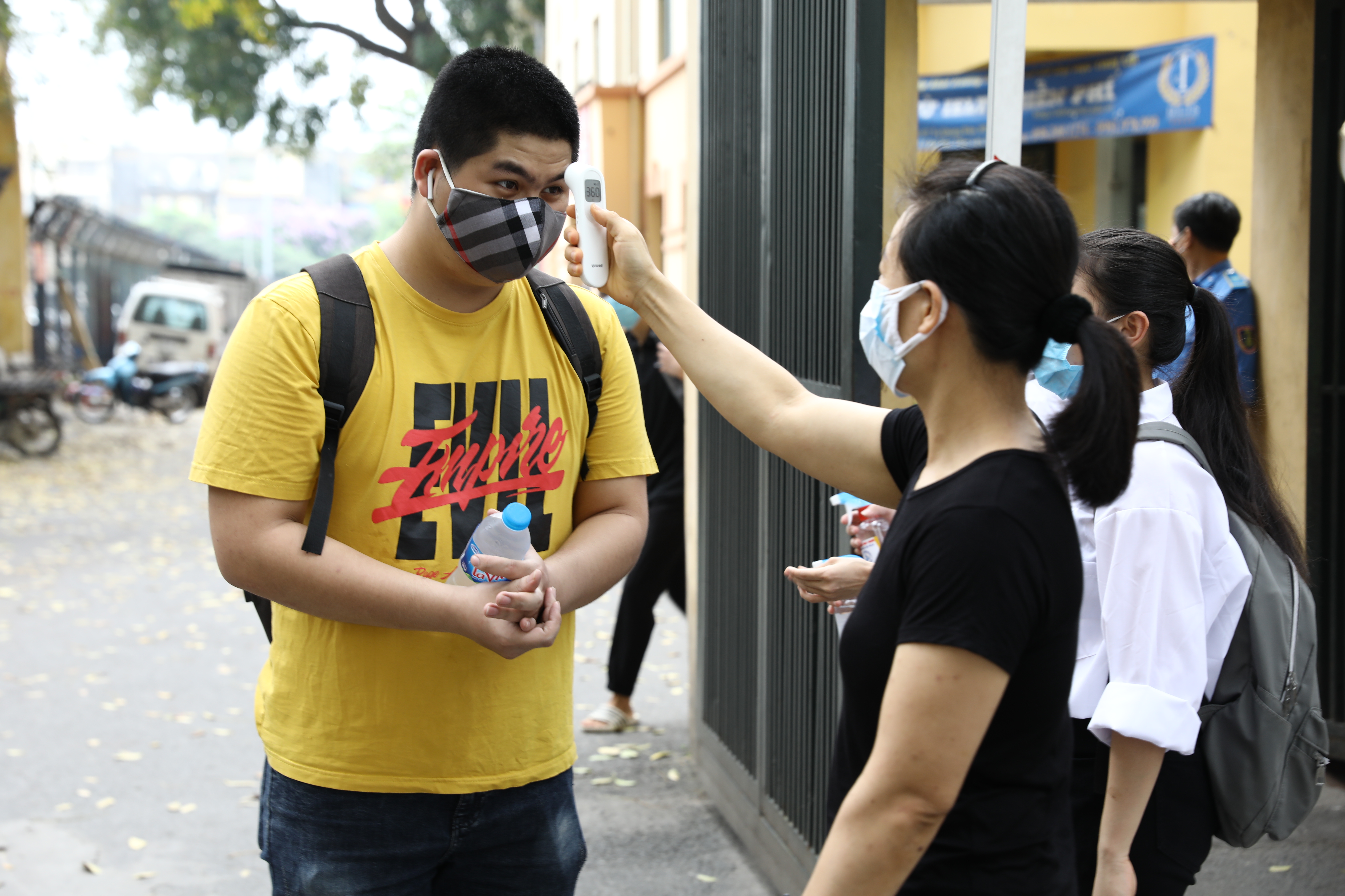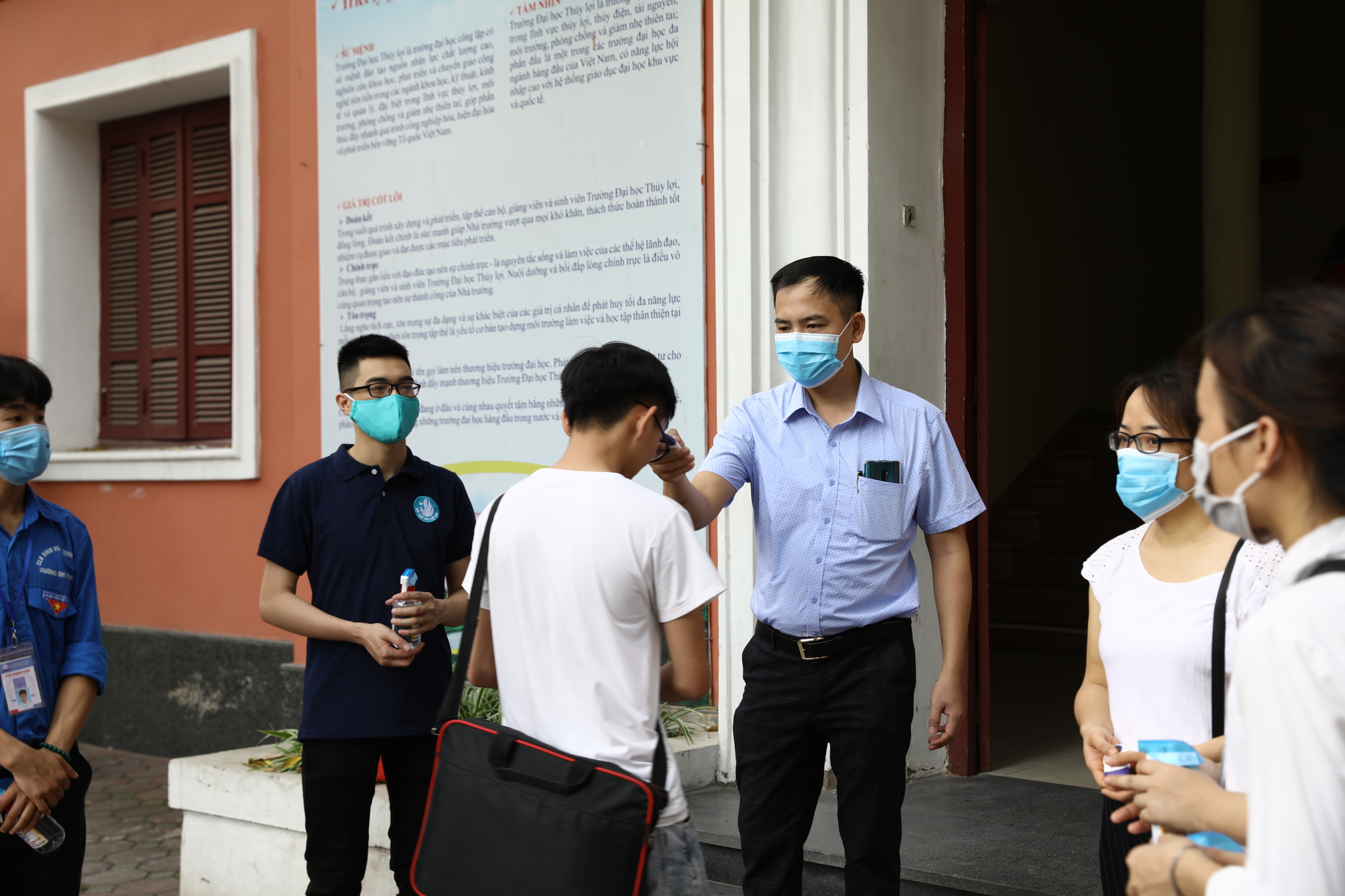 Cán bộ làm nhiệm vụ đo thân nhiệt có mặt tại các vị trí lên giảng đường