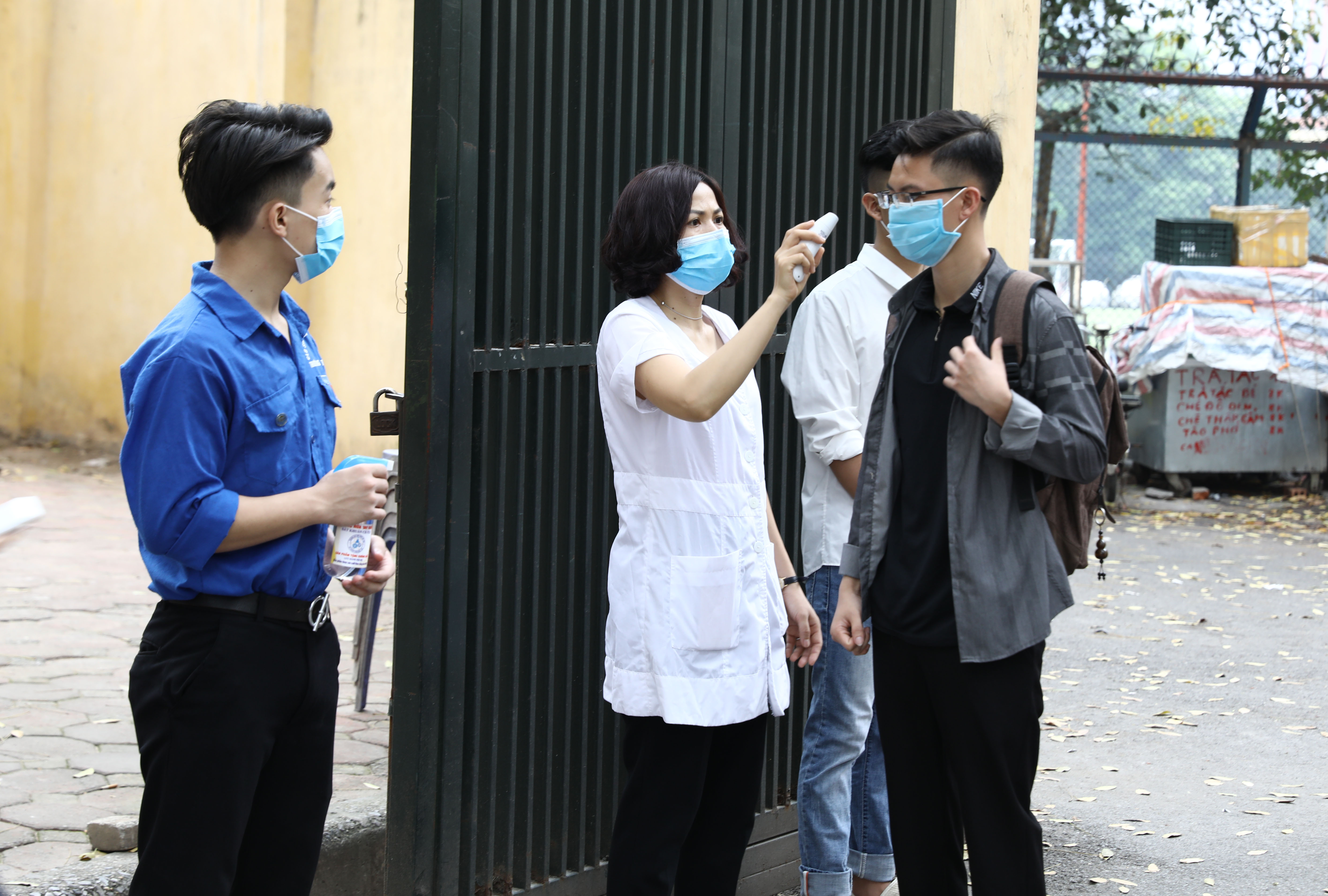 Sinh viên nghiêm túc thực hiện đo thân nhiệt, sát khuẩn tay