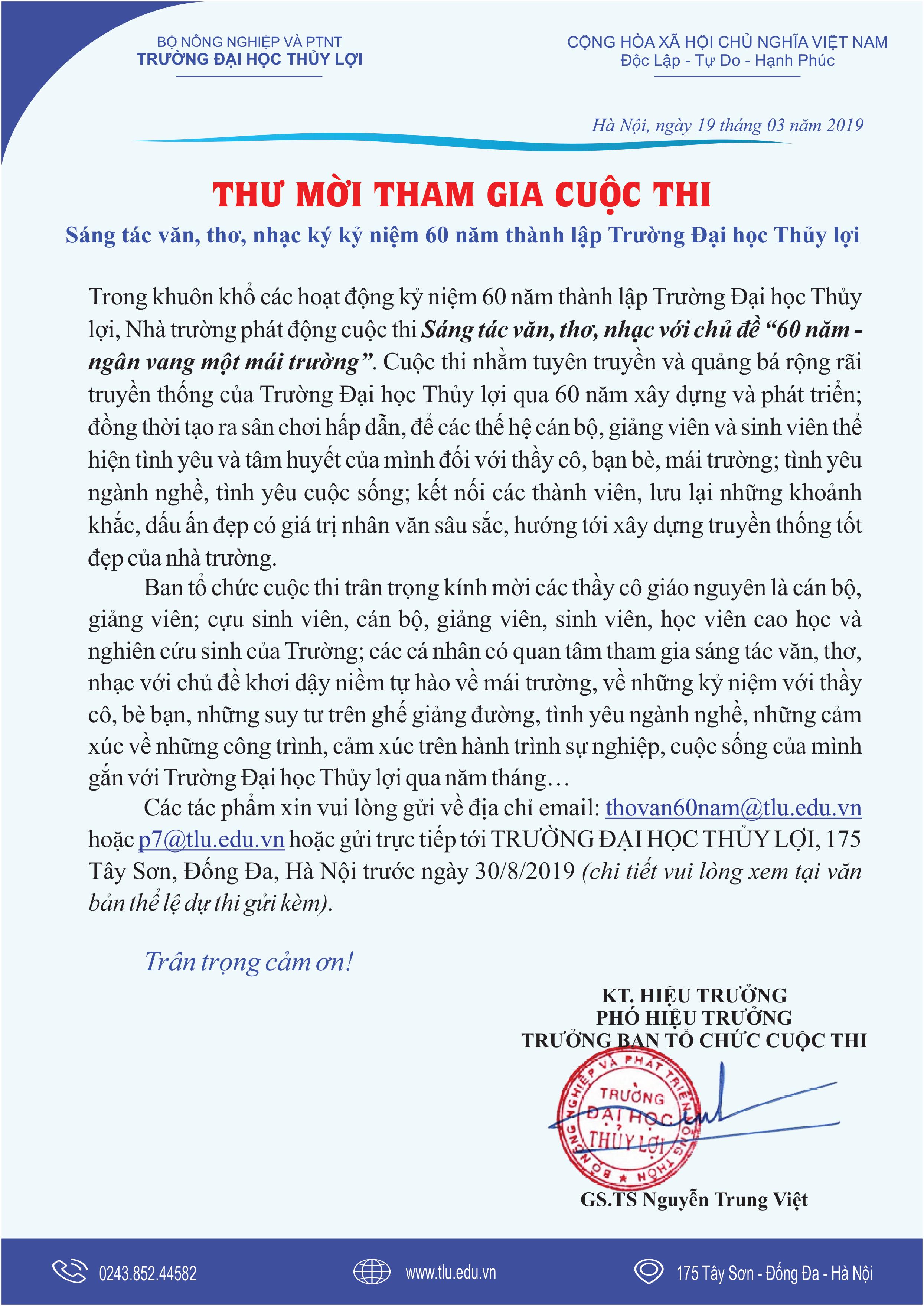 - Đối với tác phẩm gửi bằng bản cứng, qua đường bưu điện: TRƯỜNG ĐẠI HỌC THỦY LỢI, 175 Tây Sơn, Quận Đống đa, Hà Nội. Ngoài phong bì ghi rõ Bài dự thi cuộc thi “60 năm ngân vang một mái trường”