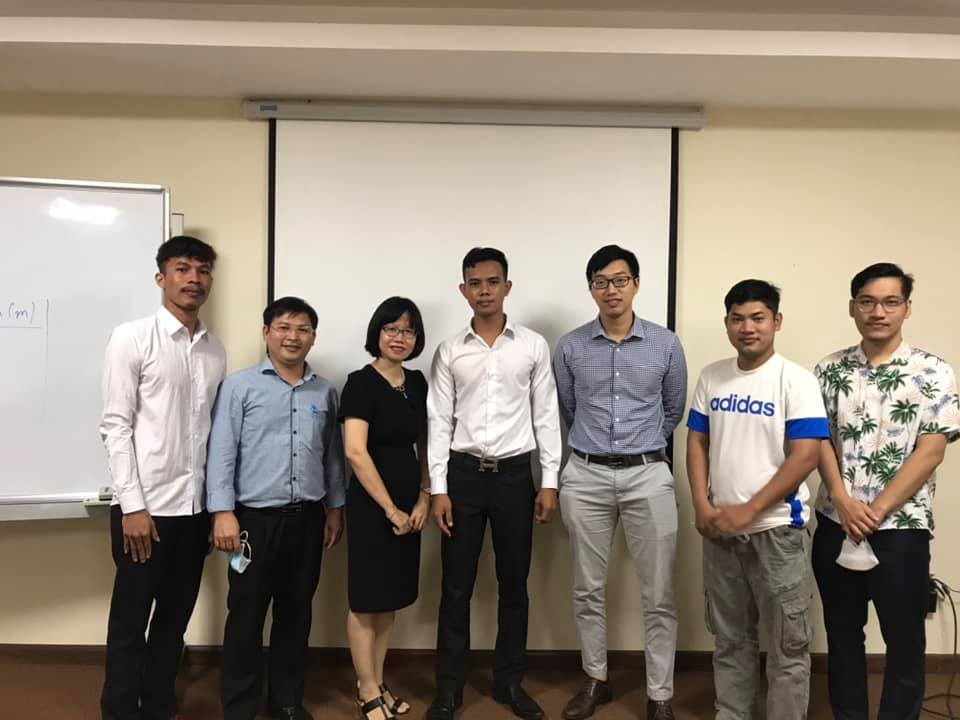 Vannet (áo sơ mi trắng đứng giữa) trong ngày bảo vệ Đồ án tốt nghiệp đại học cùng bạn bè và các thầy cô hướng dẫn