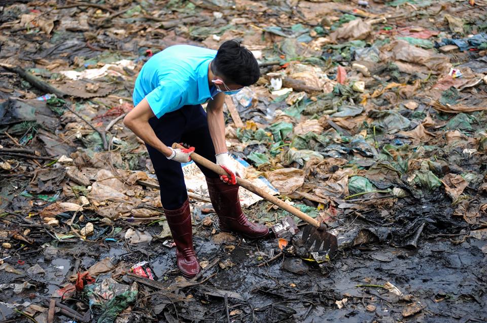 Các bạn sinh viên lội bùn đen để thu gom rác, khơi thông dòng chảy