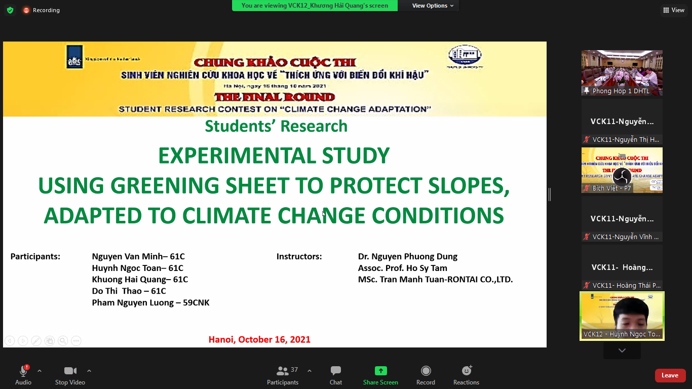 Tham dự Chung khảo cuộc thi, Trường Đại học Thủy lợi có 07 đề tài đến từ sinh viên các khoa: Kỹ thuật tài nguyên nước, Hóa – Môi trường, Công trình, Kinh tế và Quản lý. Các đề tài dự thi tập trung chủ yếu vào các lĩnh vực nghiên cứu thế mạnh của trường như: thủy văn, tài nguyên nước, thiết kế công trình, phòng tránh và giảm nhẹ thiên tai, xử lý môi trường. Trong đó, các nghiên cứu đã làm rõ các tác động của biến đổi khí hậu đến các hoạt động kinh tế, xã hội và con người, từ đó đề xuất các giải pháp thích ứng và giảm nhẹ thiệt hại.