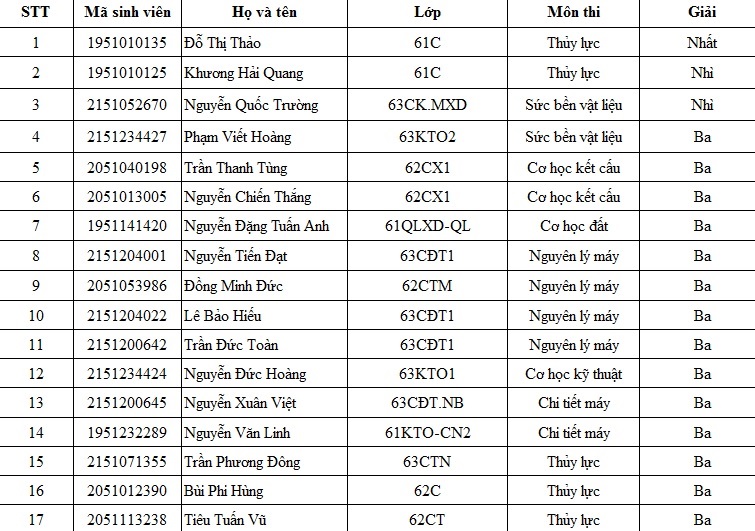 Lễ tổng kết và trao giải cuộc thi Olympic Cơ học toàn quốc lần thứ XXXIII năm nay diễn ra tại Học viện Kỹ thuật Quân sự vào sáng 10/6. Kết quả Trường Đại học Thủy lợi đạt 01 Giải Nhì đồng đội môn Thủy lực; 17 giải cá nhân (gồm: 1 giải Nhất, 2 giải Nhì, 14 giải Ba). Cụ thể như sau: