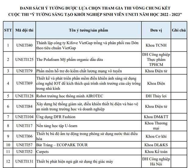 Kết thúc vòng bán kết, Ban giám khảo đã chọn được 12 ý tưởng xuất sắc nhất tham dự vòng chung kết. Trong số 12 ý tưởng được lựa chọn vào Vòng chung kết có dự án khởi nghiệp của sinh viên Trường Đại học Thủy lợi, đó là dự án “Robot trường học thông minh AIROTEC”.
