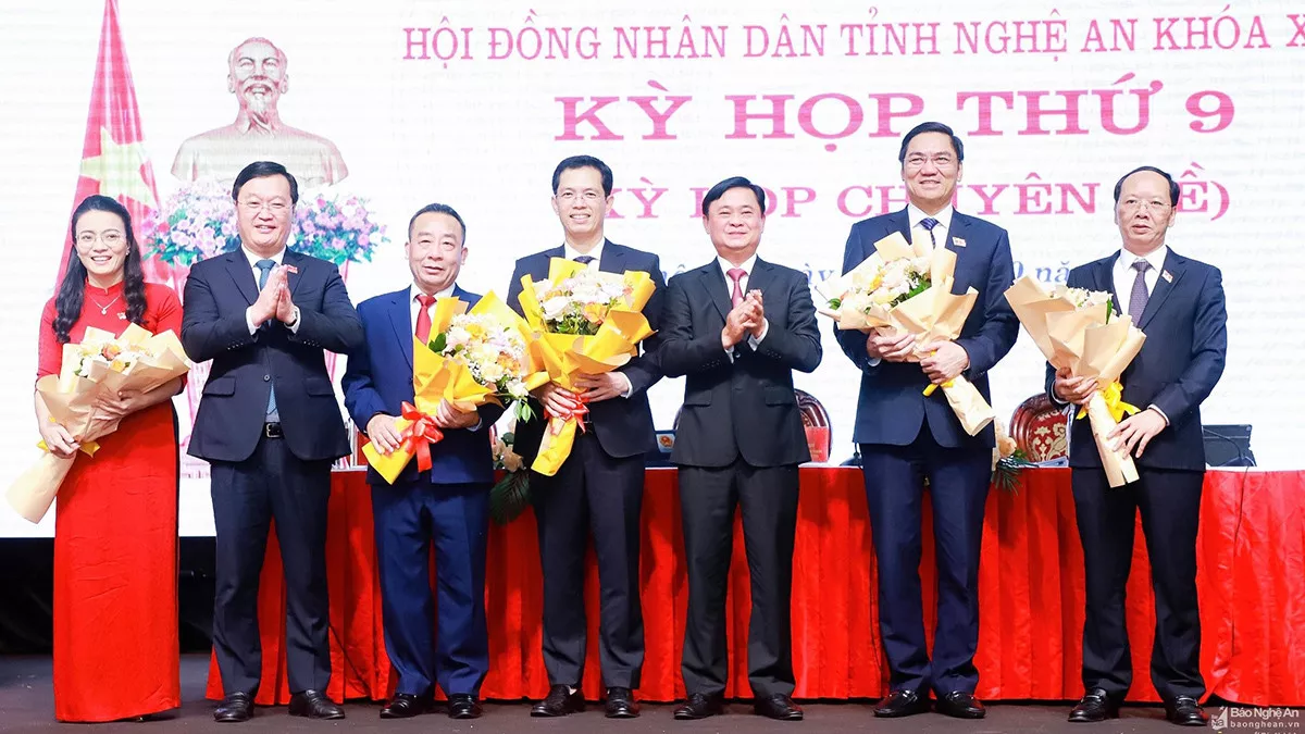 Lãnh đạo tỉnh Nghệ An tặng hoa chúc mừng ông Hoàng Nghĩa Hiếu, Phó Bí thư Tỉnh uỷ (thứ 2 bên phải sang) và Phó Chủ tịch UBND tỉnh Nguyễn Văn...