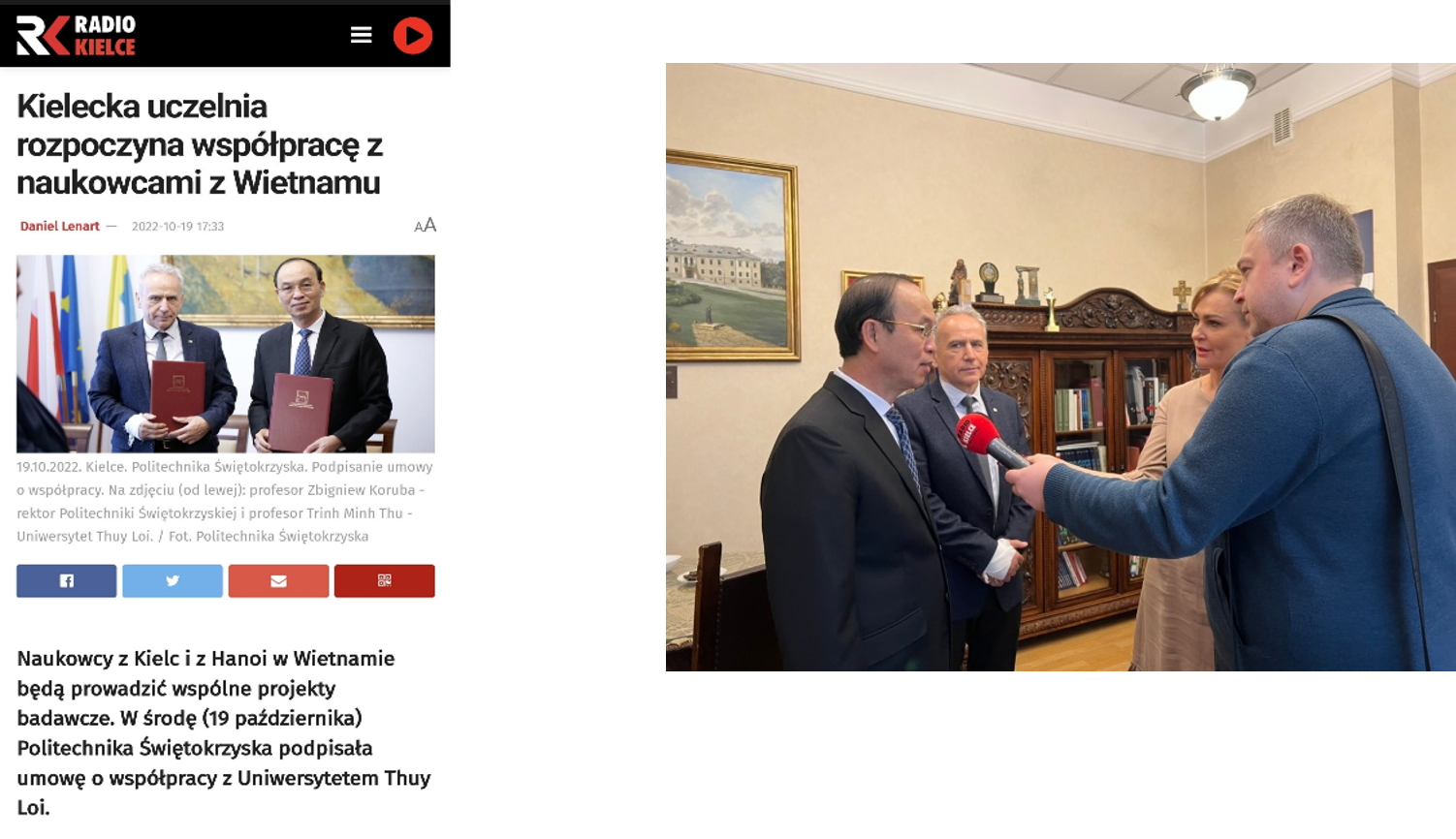 Đặc biệt, dựa trên mối quan hệ hợp tác thân thiết, hiệu quả trong thời gian qua, Đại học Bách Khoa Kielce và Trường Đại học Thủy lợi đã nhất trí ký kết Biên bản Ghi nhớ để hai bên cùng phối hợp triển khai tích cực hơn nữa các hợp tác về nghiên cứu khoa học, đào tạo và tư vấn trong lĩnh cực kỹ thuật dân dụng. Với hệ thống phòng thí nghiệm hiện đại, Đại học Bách Khoa Kielce luôn nhiệt tình tiếp nhận các giảng viên, sinh viên của Nhà trường sang thực tập.
